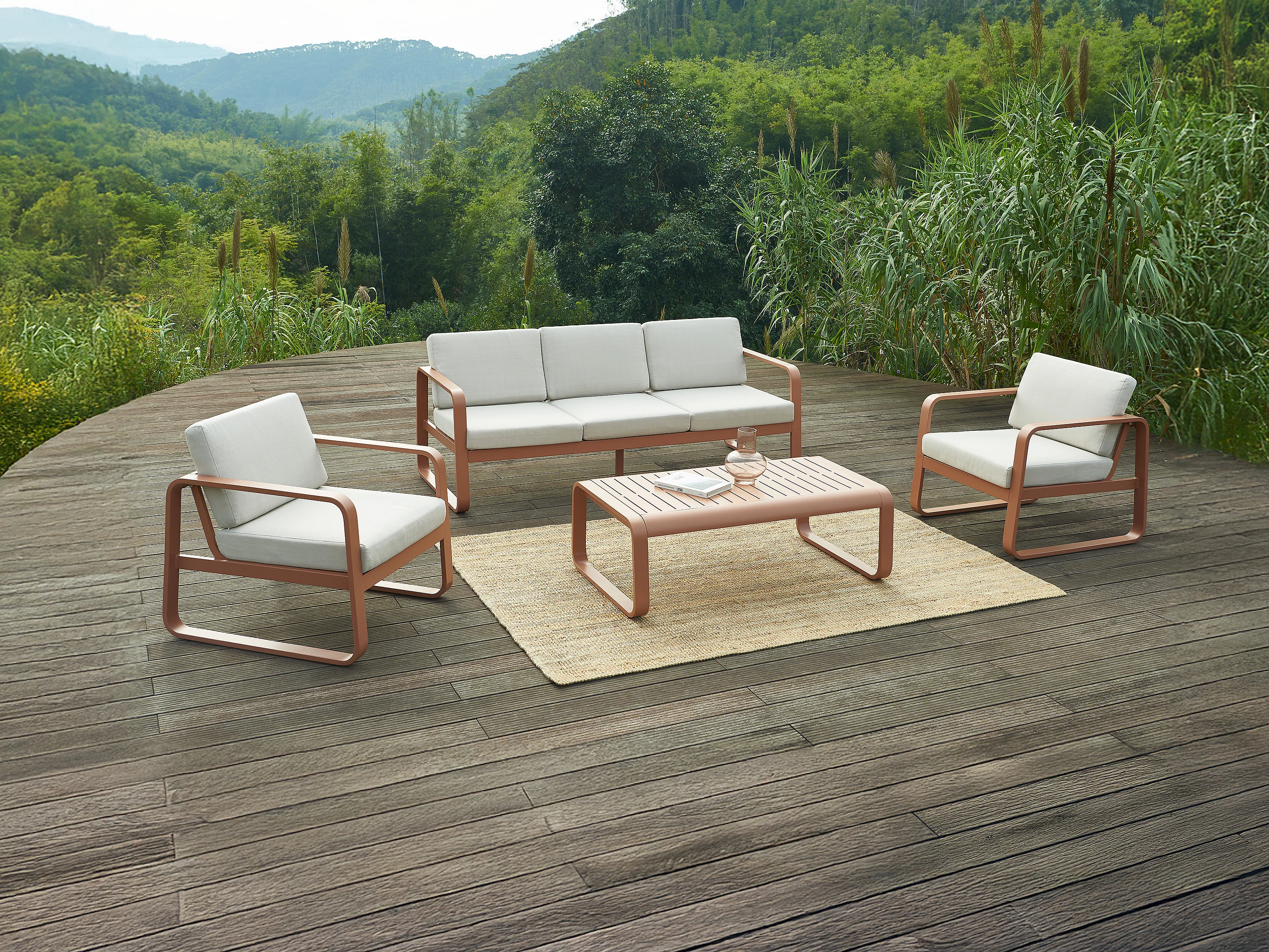 Salon de jardin en aluminium : 1 canapé 3 places et 1 table basse - Cuivré avec coussins beiges - LOMIA de MYLIA