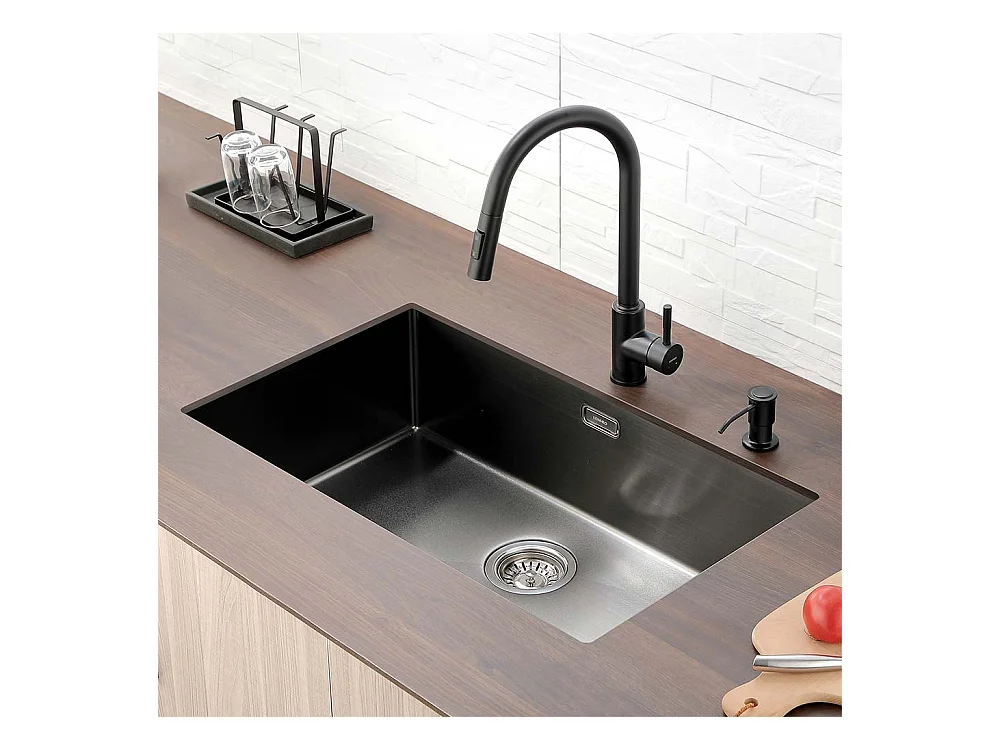 Évier Cuisine 1 Bac 74*44*20CM,Inox avec Siphon/Trop-Plein+Robinet Cuisine avec Douchette Extractible,Eau Froide /Chaude,Bec en Forme de U,Noir
