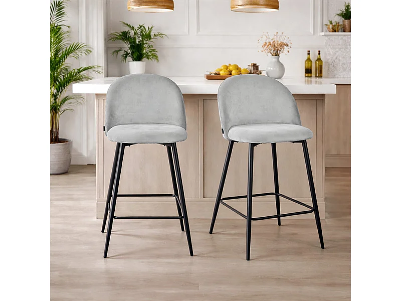 Lot 2 chaises de bar en velours gris clair et pieds en métal - FARA 2