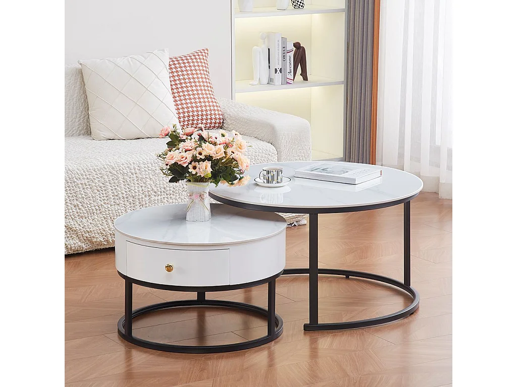 Lot 2 Tables Basses Gigognes NOVELA Avec Tiroir Céramique Marbre Blanc Métal Noir D80/D60x45/40cm