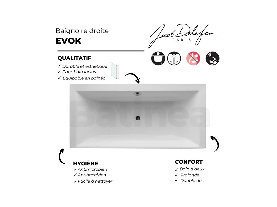 Lot baignoire droite 180 X 80 JACOB DELAFON Evok + pare-bain noir mat
