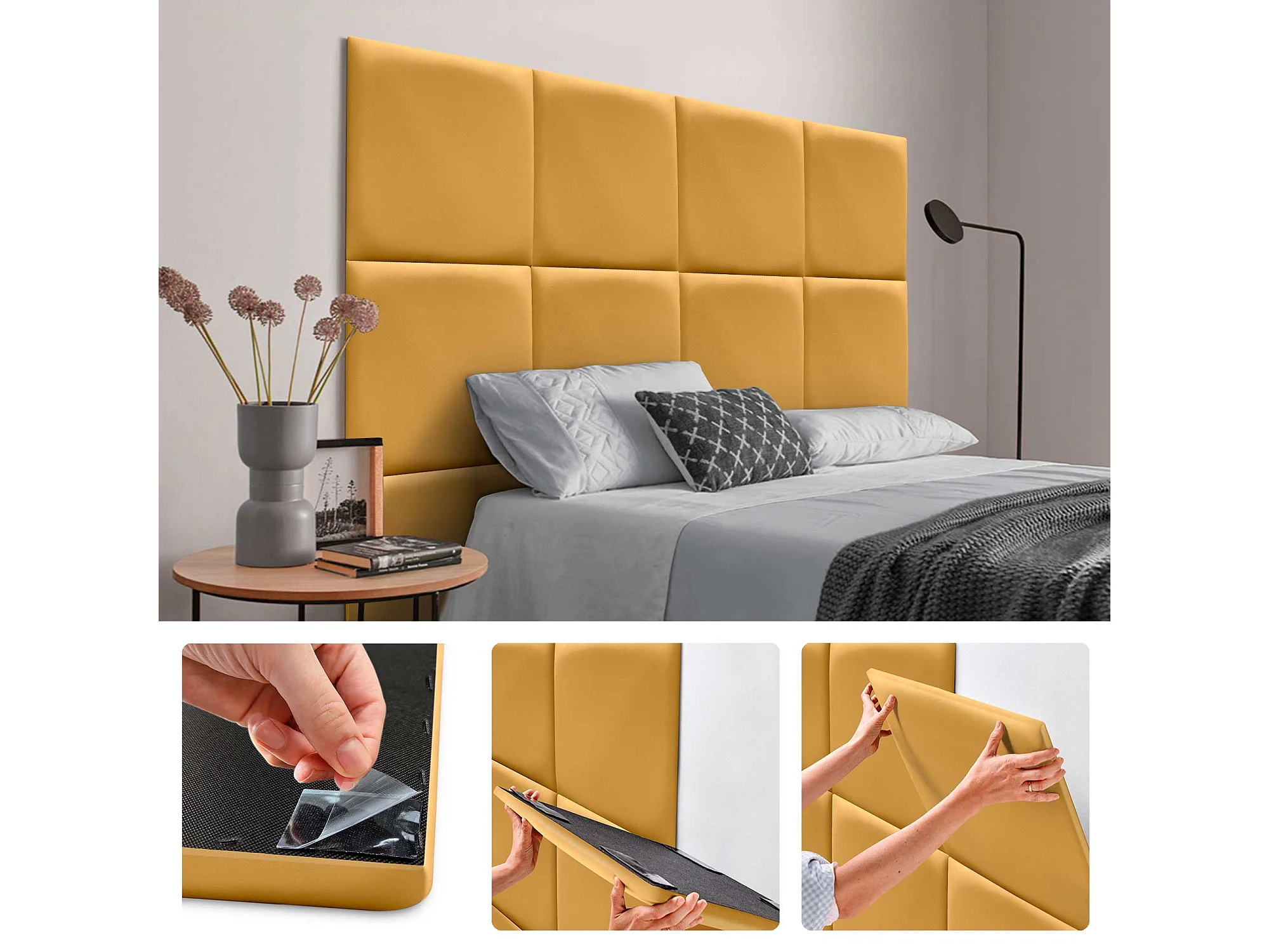 Lot de 1 panneau rembourré en similicuir écologique DHOME autocollant pour protection acoustique murale absorbante (Moutarde, 60x60cm, x6)