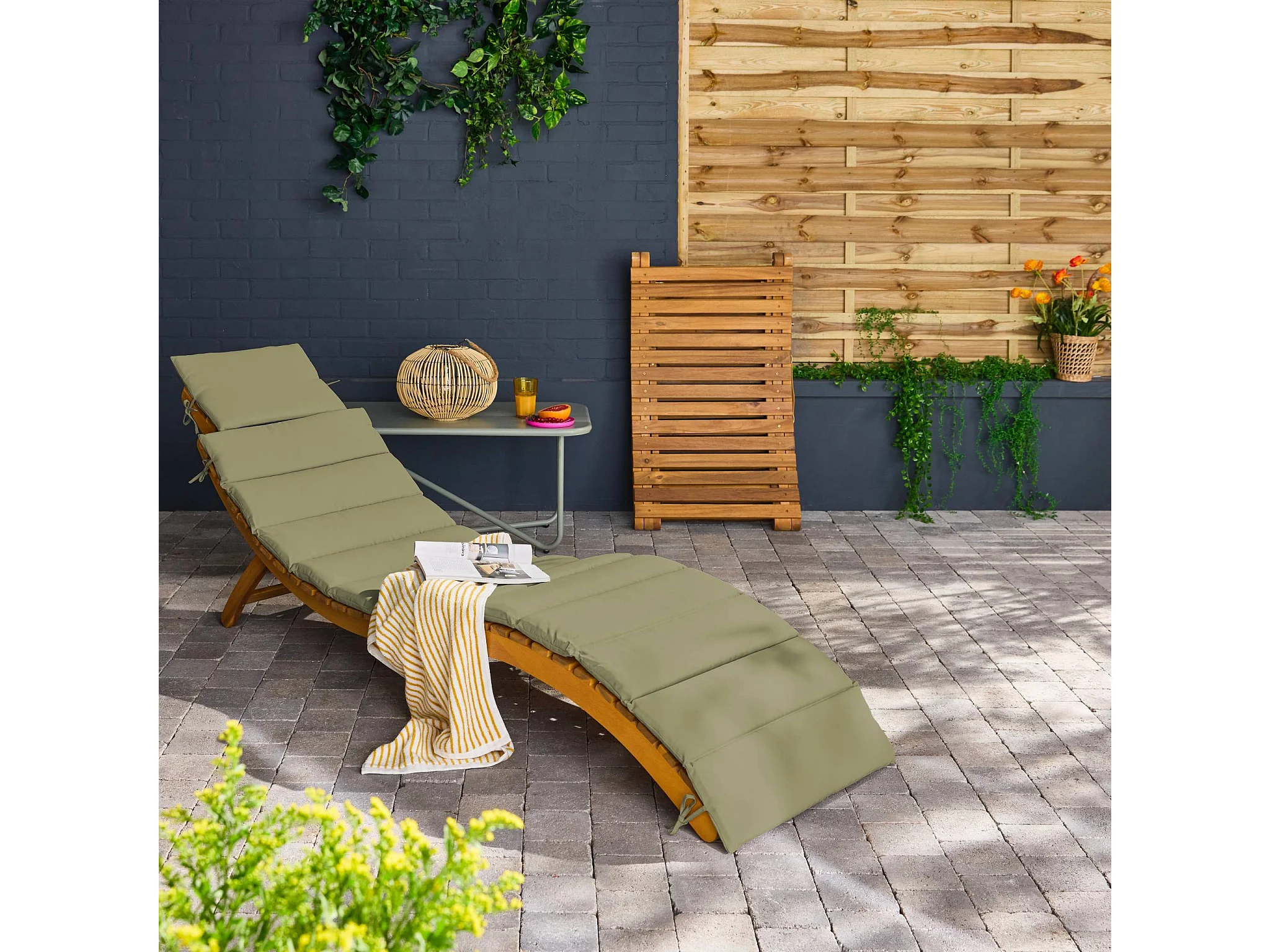 Lot de 2 bains de soleil en bois d'acacia LAURE avec coussin kaki en polyester. 184 x 55 x 63.5 cm