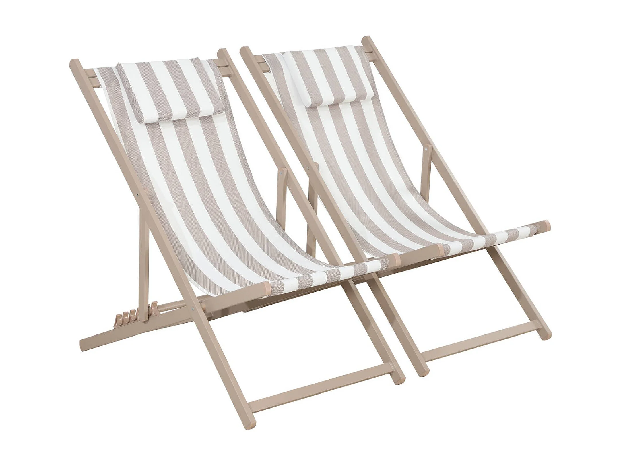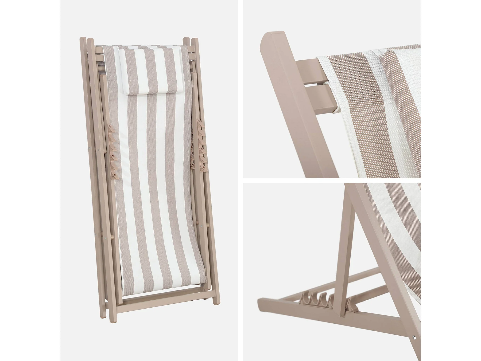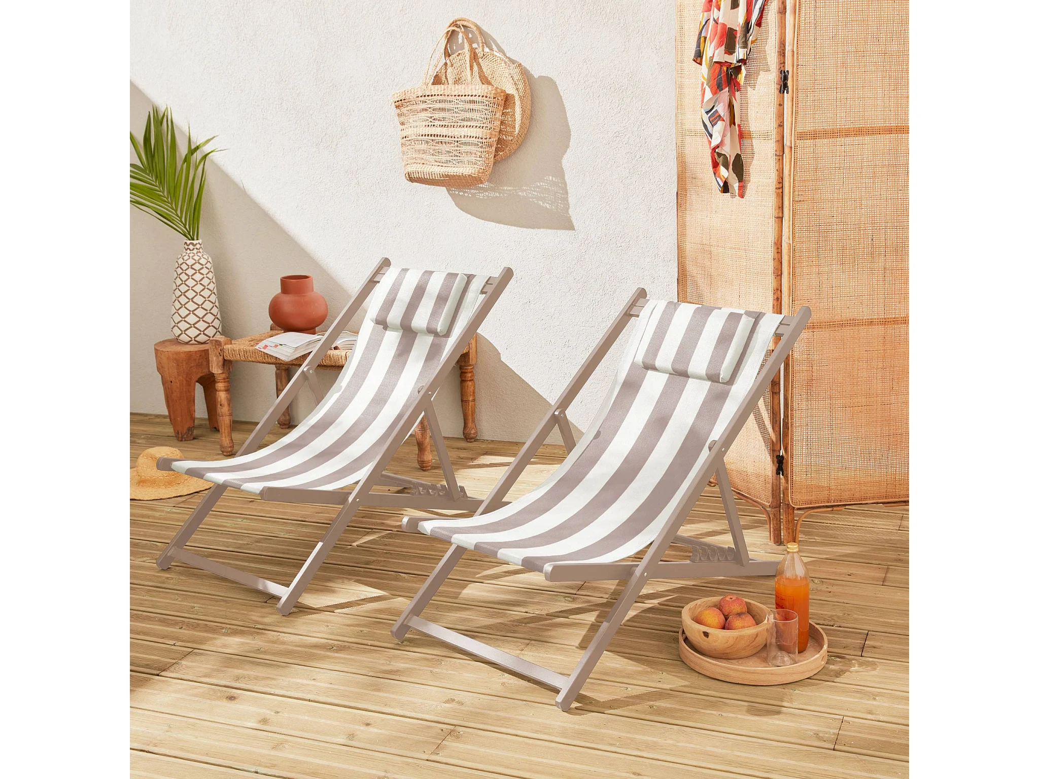 Lot de 2 bains de soleil - Gaia rayures marron - Transat en aluminium gris anthracite et textilene rayures marron avec coussin repose tête. chilienne