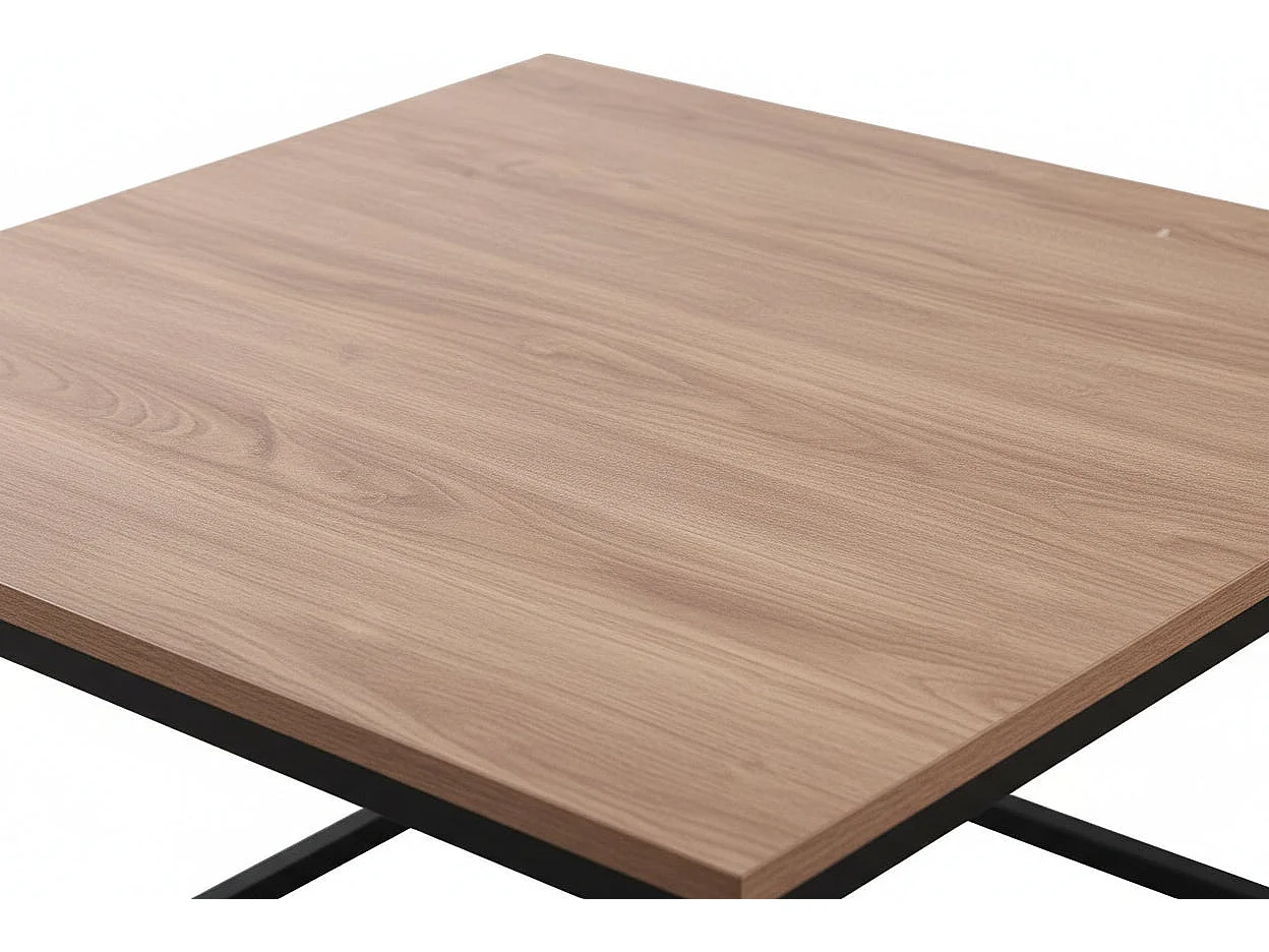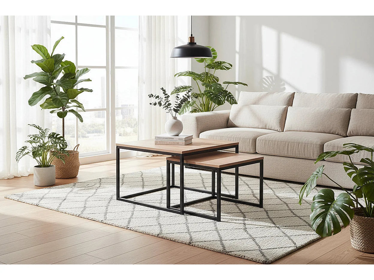 Lot 2 Tables Basses Gigognes BELGRADE Métal Noir Plateau Bois Effet Chêne Griffé 70x70x46 / 50x50x40cm