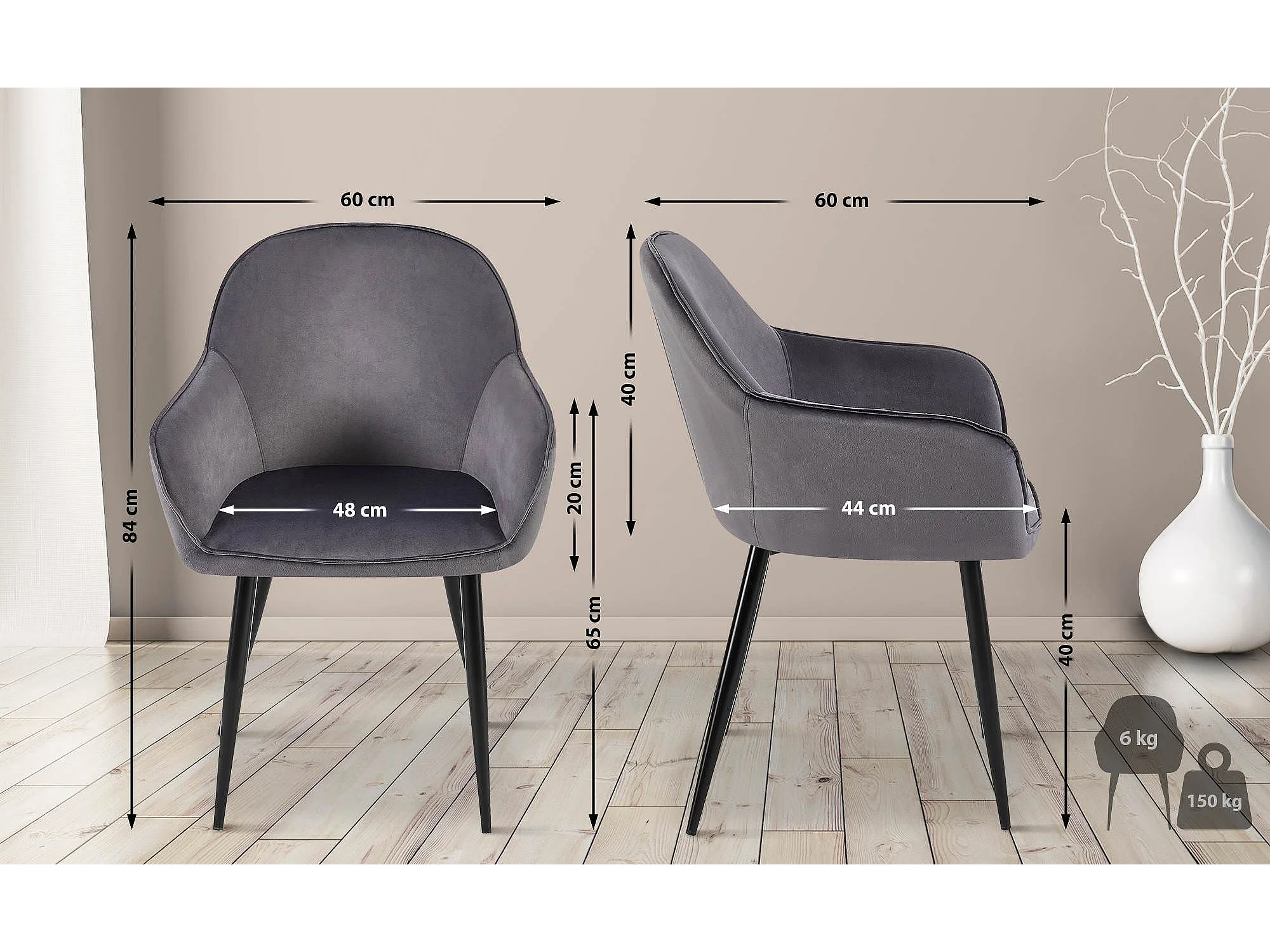 Lot de 2 chaises avec accoudoirs - Velours - Gris foncé - Boise