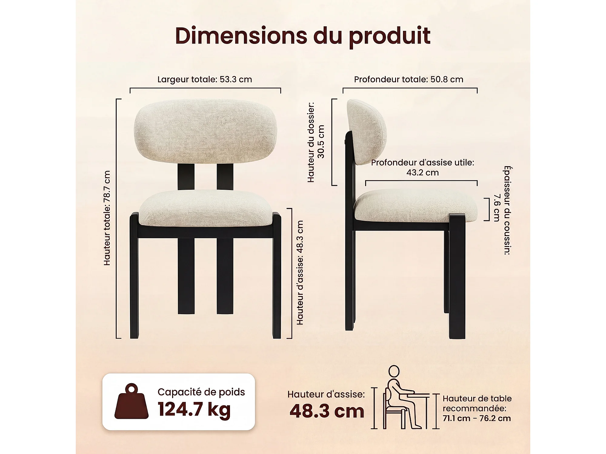 Lot de 2 chaises beige SMARTUE, revêtement en tissu chenille, assise épaisse, dossier incurvé, pieds noirs en bois d’hévéa