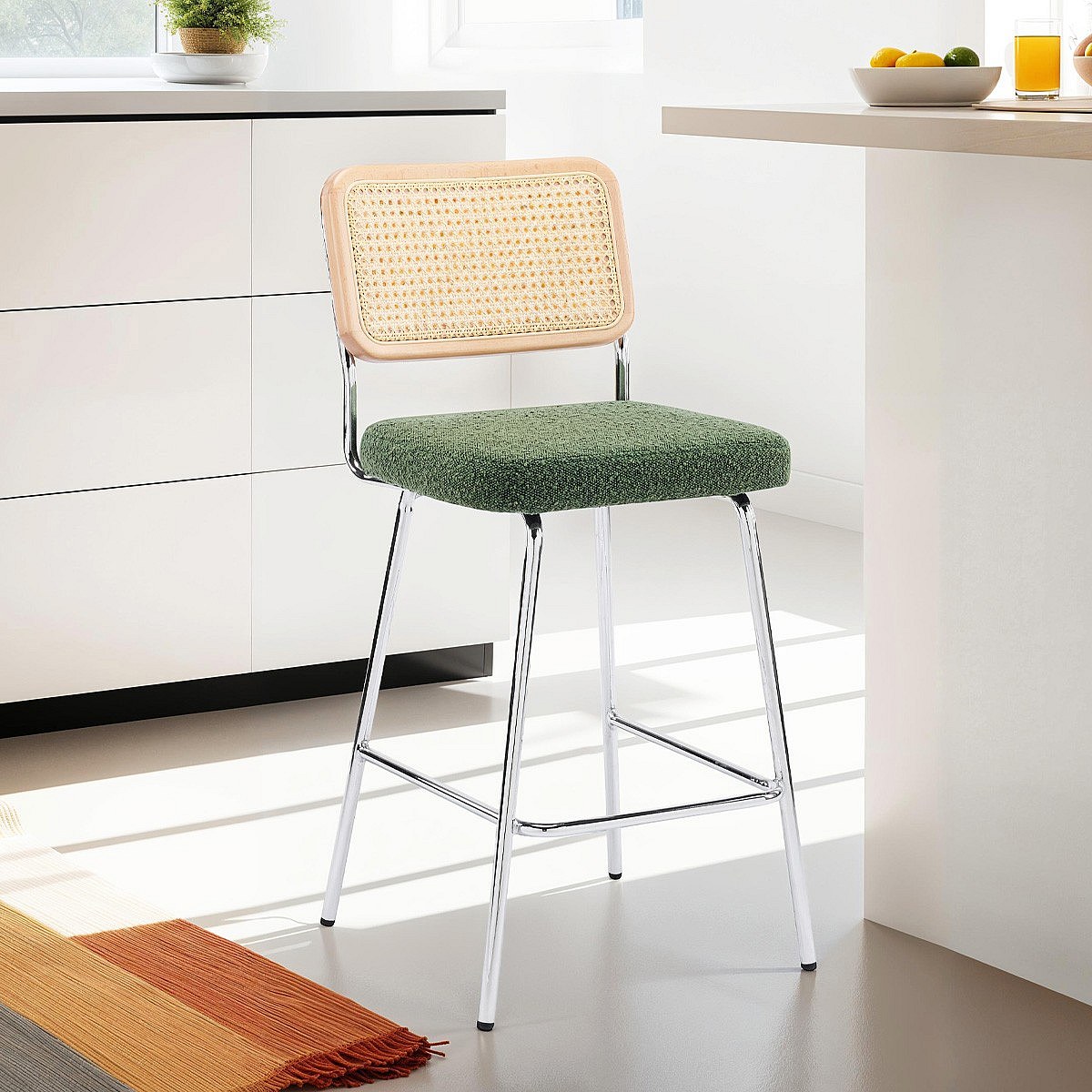Lot de 2 chaises de bar en cannage et tissu bouclé vert, piètement chromé - Muse