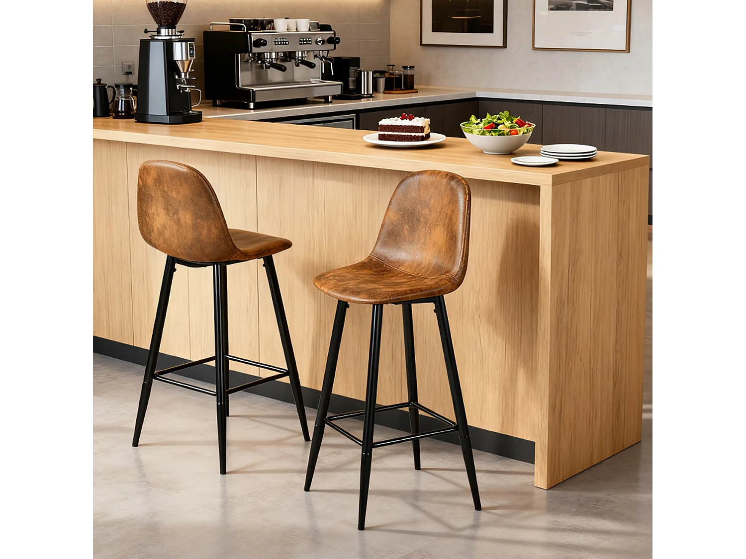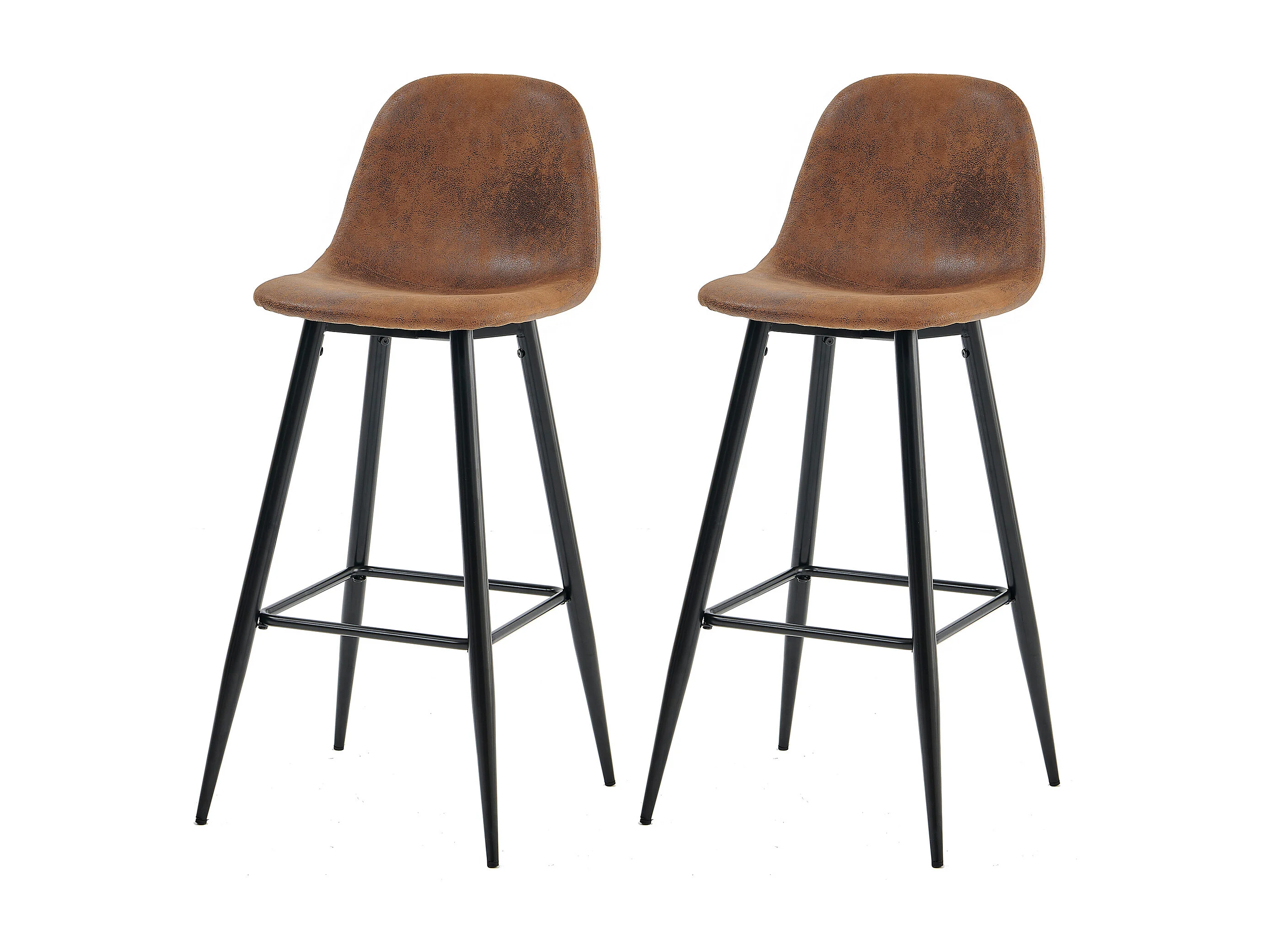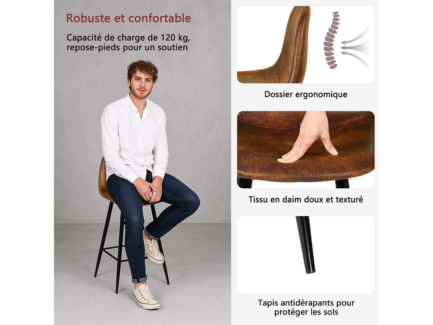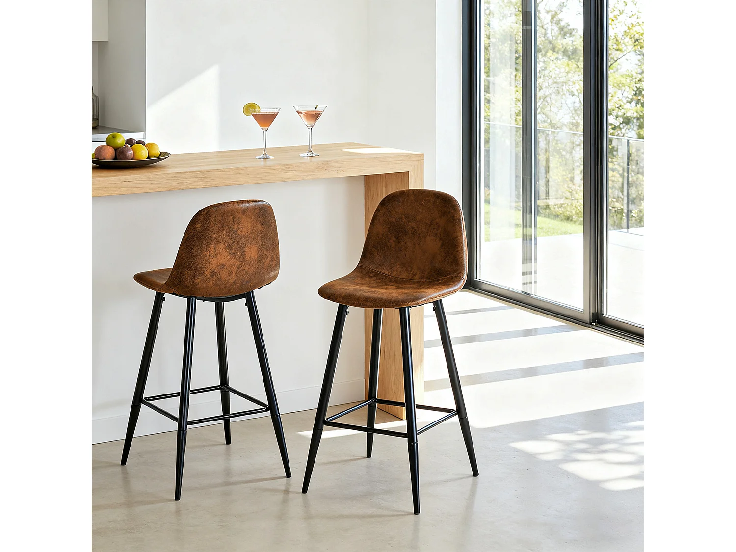 Lot de 2 Chaises de Bar Hautes - Siège en Tissu en Daim Marron, Pieds en Métal Noir - Style Vintage
