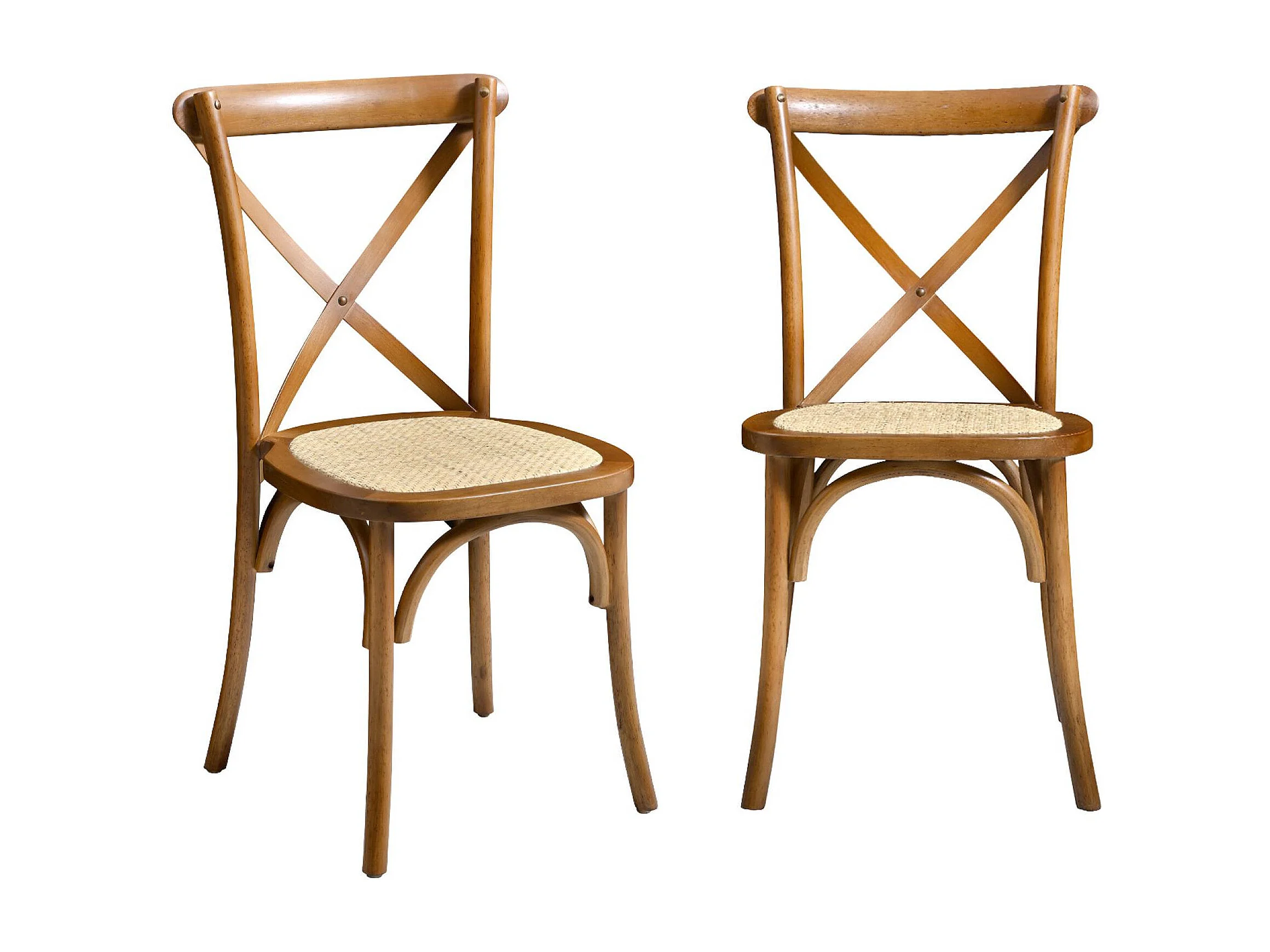 Lot de 2 chaises de bistrot en bois d'hévéa effet noyer. vintage. assise en rotin. empilables