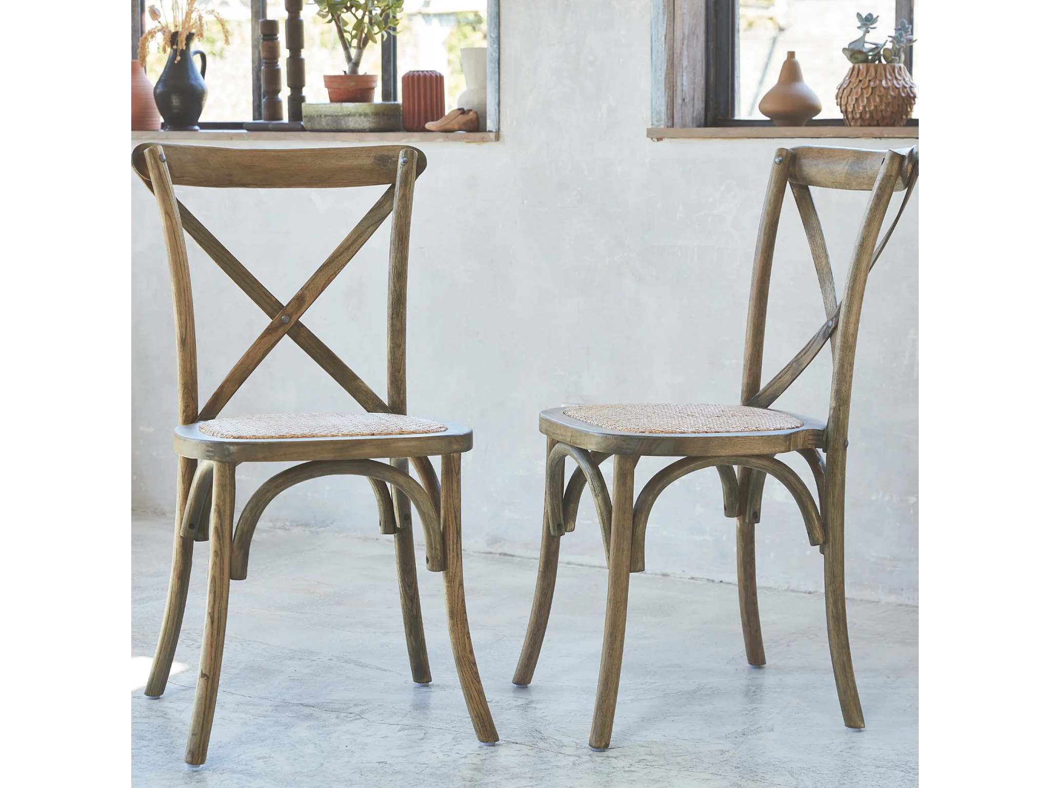 Lot de 2 chaises de bistrot en bois d'hévéa marron vieilli. vintage. assise en rotin. empilables