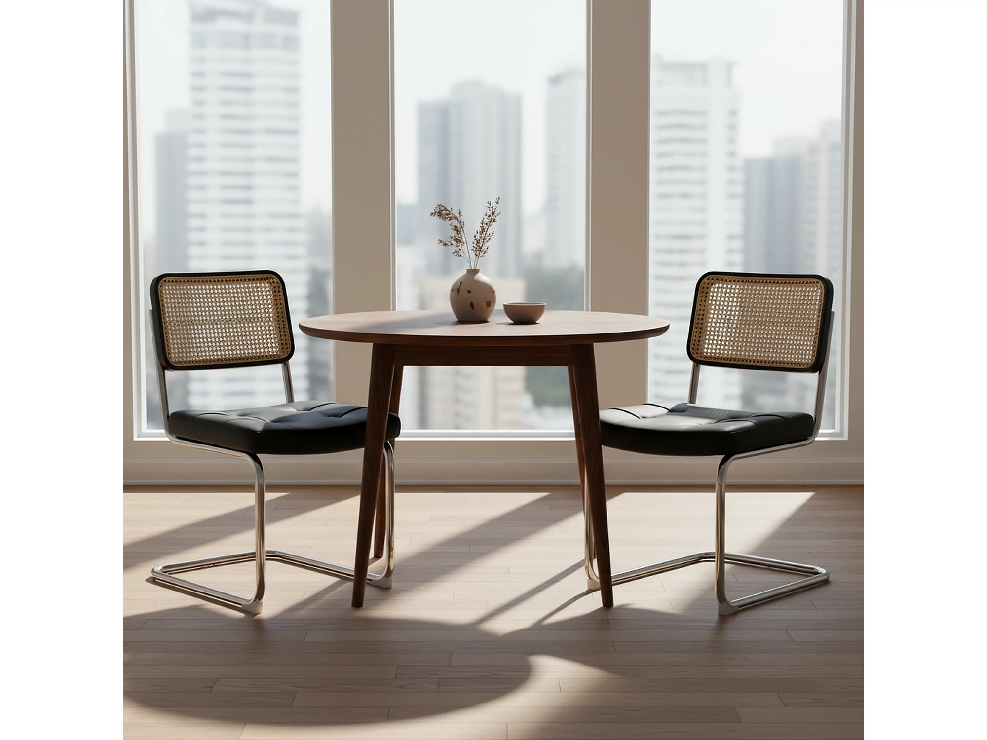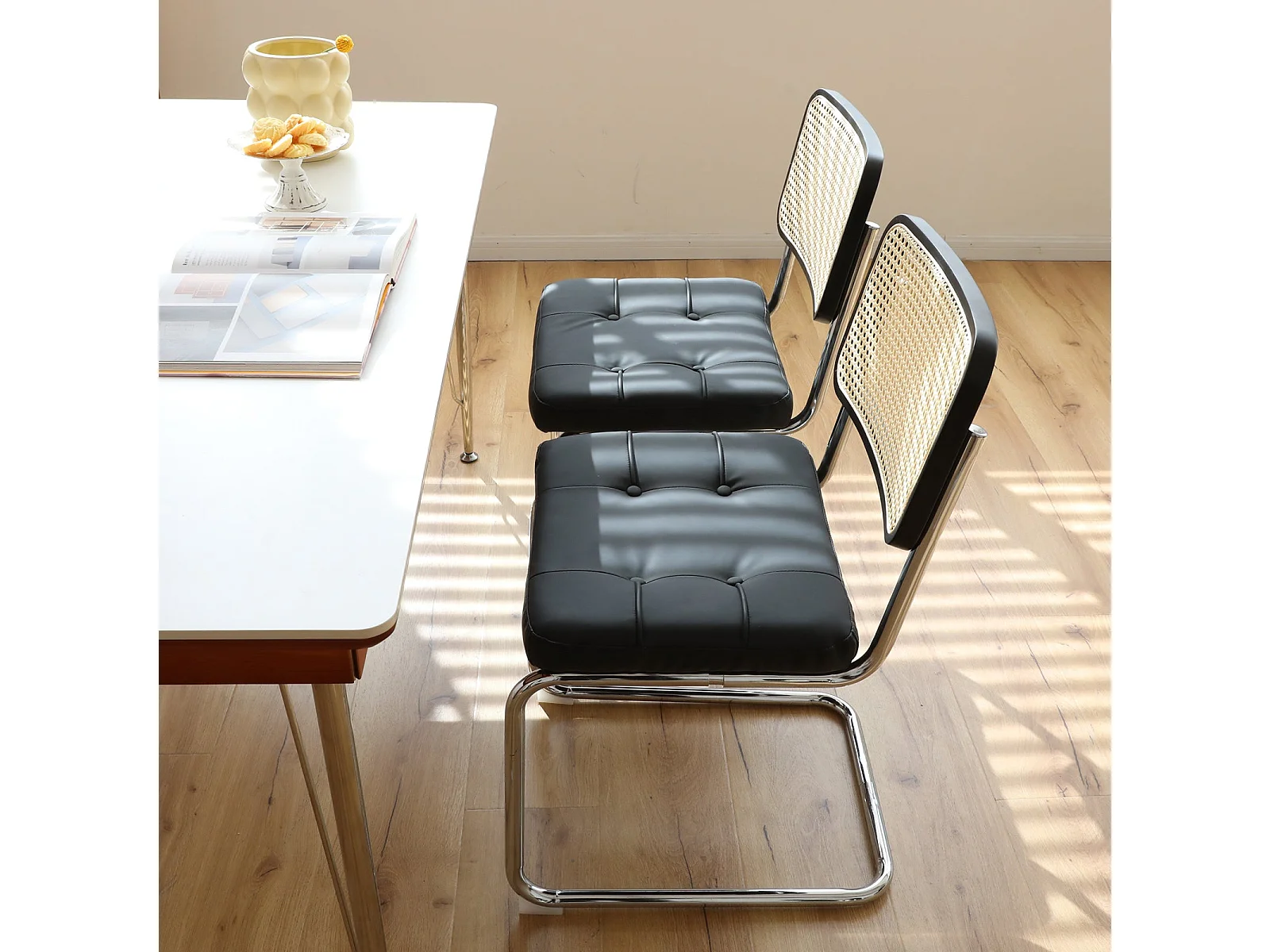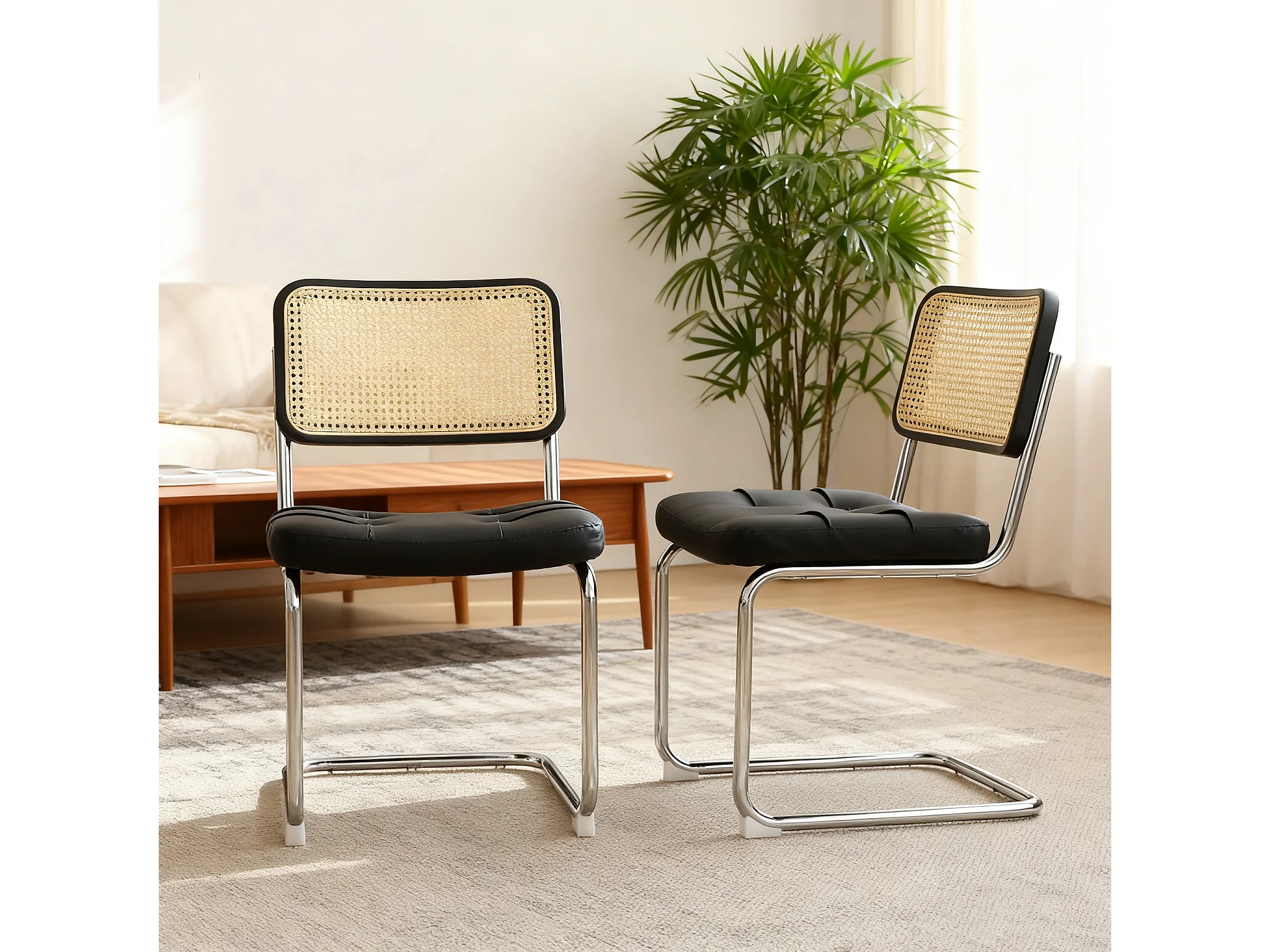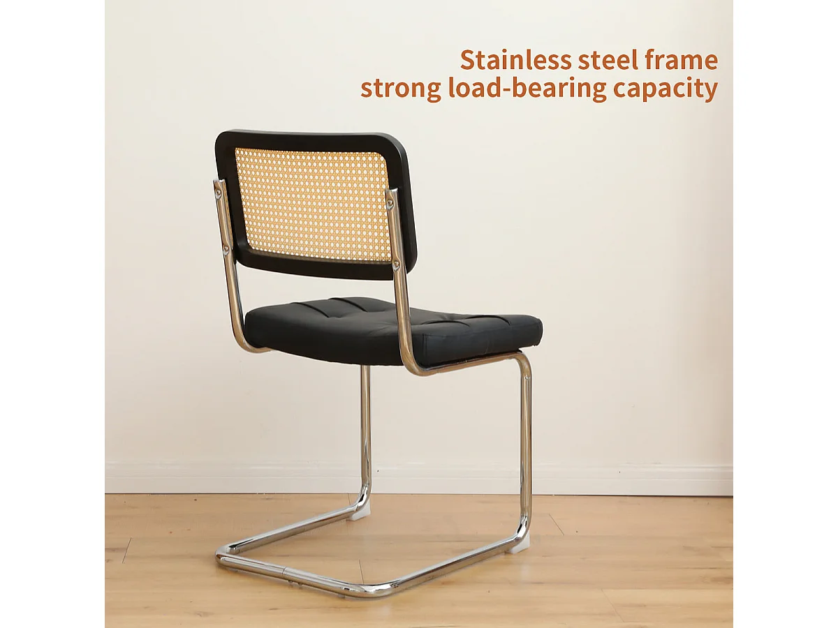 Lot de 2 chaises de salle à manger Breuer en PU noir et dossier en rotin, pieds chromés
