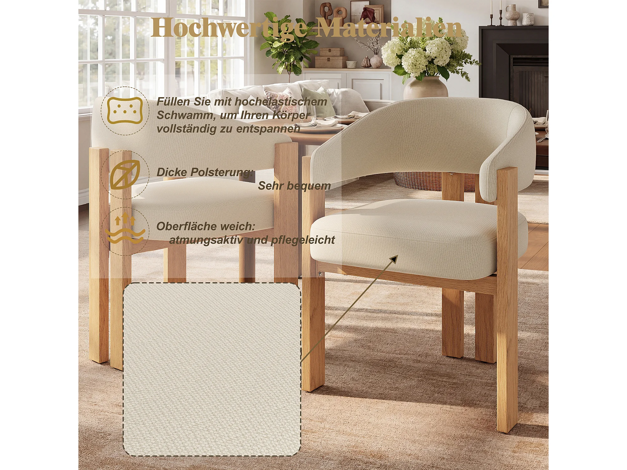 Lot de 2 Chaises de salle à manger ergonomique - 57.5 x 43 x 78 cm - avec rembourrage + pieds en fer - Flanelle - beige + naturel