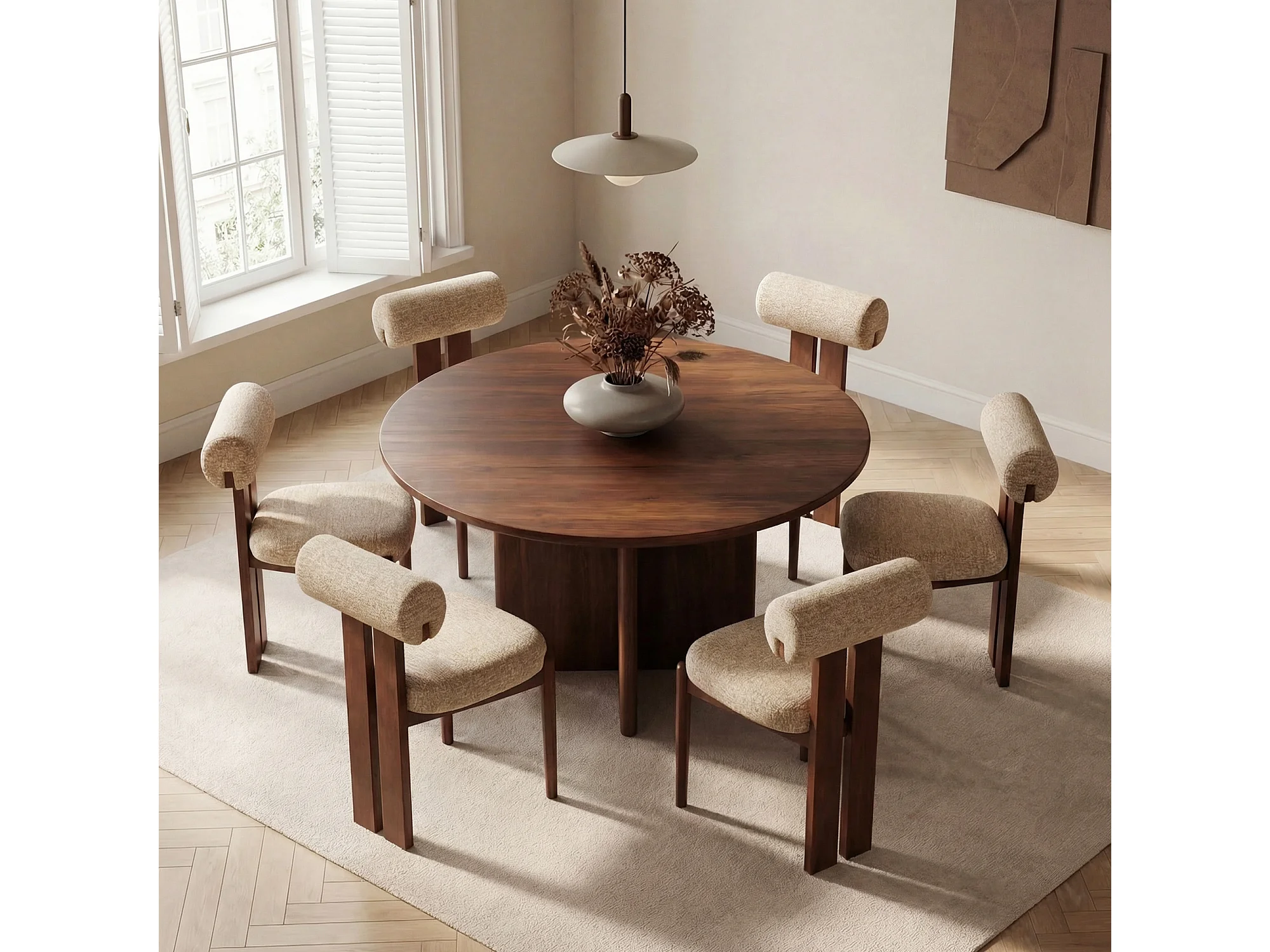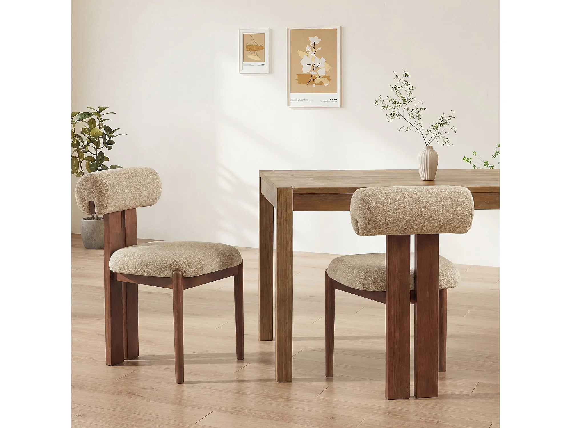 Lot de 2 chaises de salle à manger modernes, dossier cylindrique, cadre en bois, pieds noyer foncé, Camel