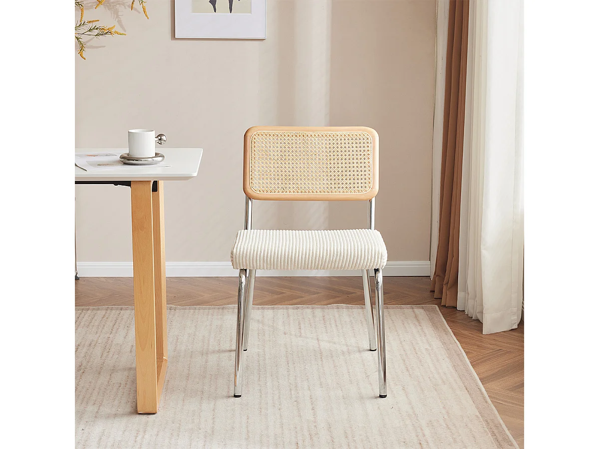 Lot de 2 chaises en métal chromé, cannage naturel et velours côtelé beige - Paula
