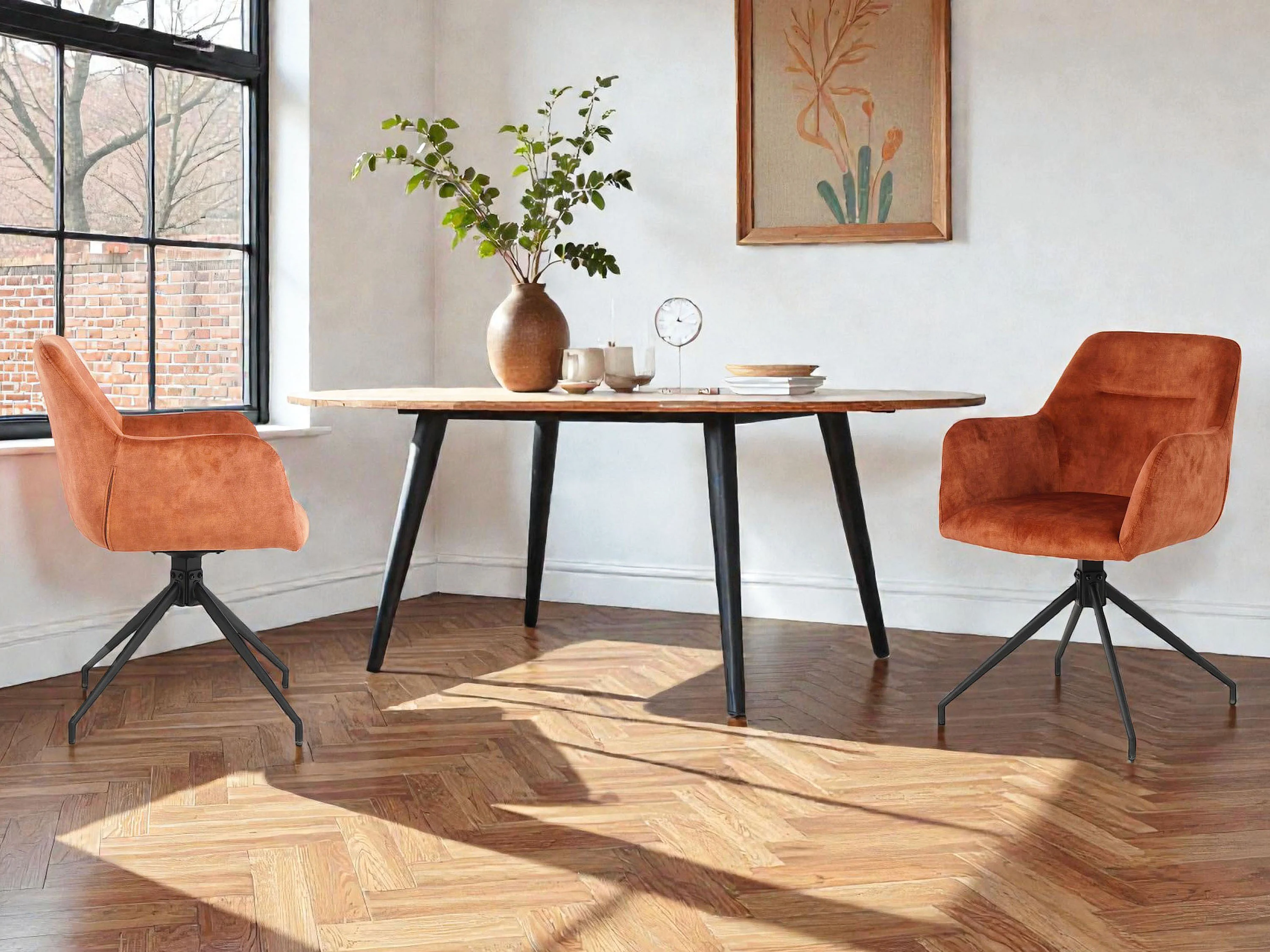 Lot de 2 chaises fauteuils de table MORINI pivotants avec accoudoirs en velours orange pour salle à manger, pieds en métal noir