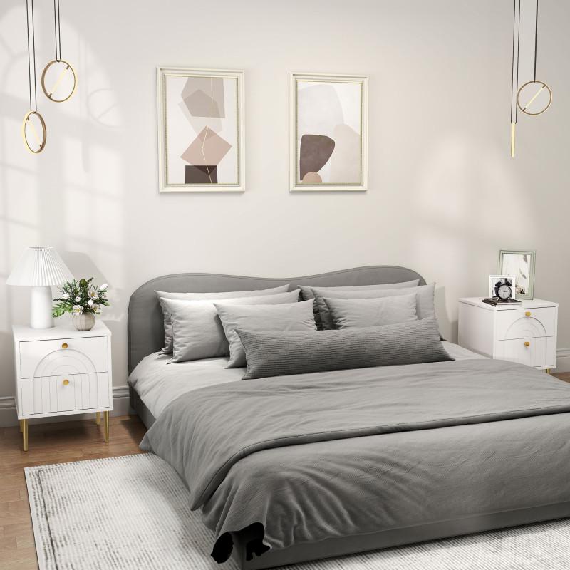 Table de chevet blanche à motifs ondulés avec 2 tiroirs, MDF et métal (53x41.3x52.5cm)