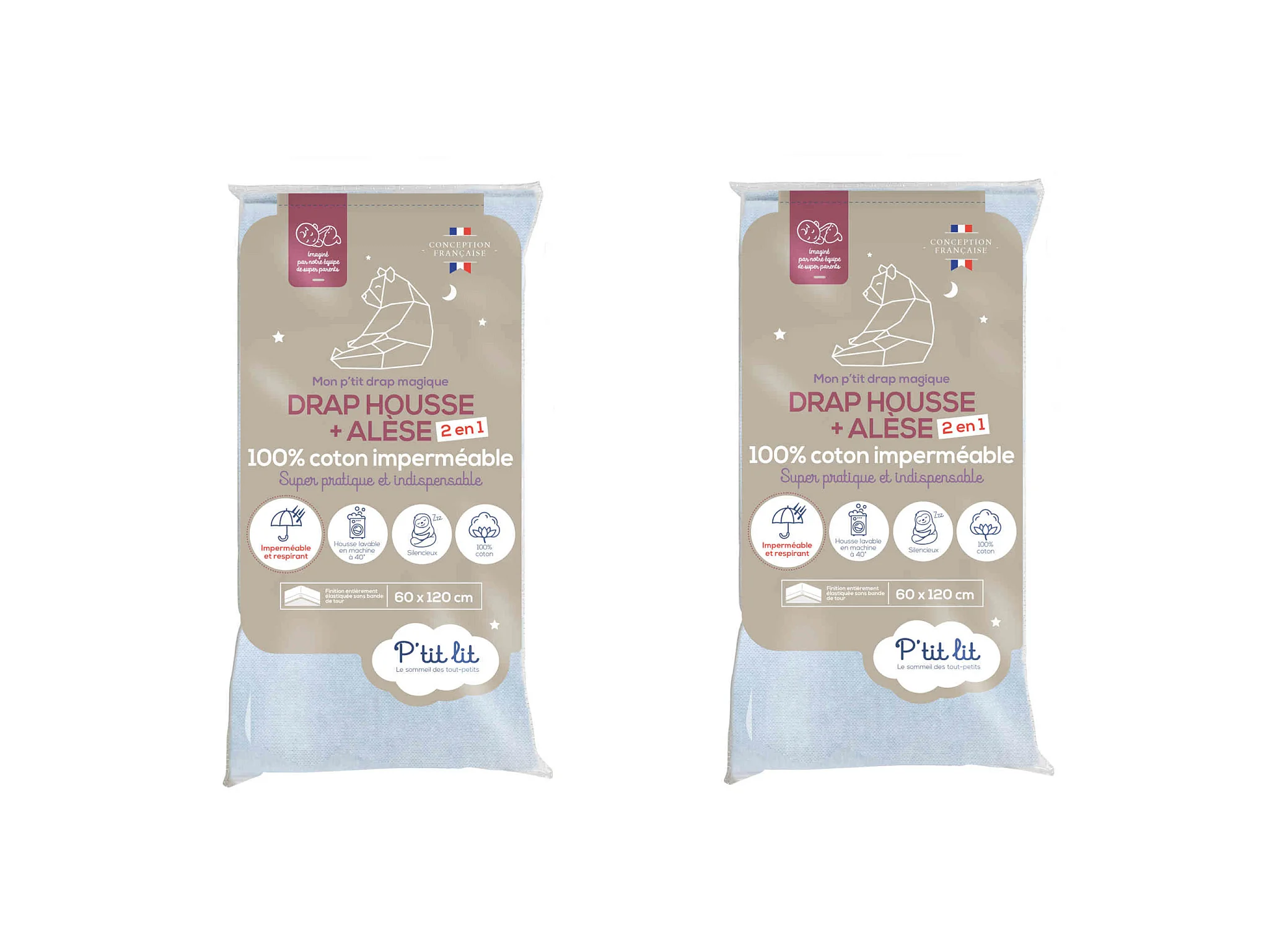 Lot de 2 draps housses bébé + alèses 2 en 1 coton imperméable gris 60x120 cm