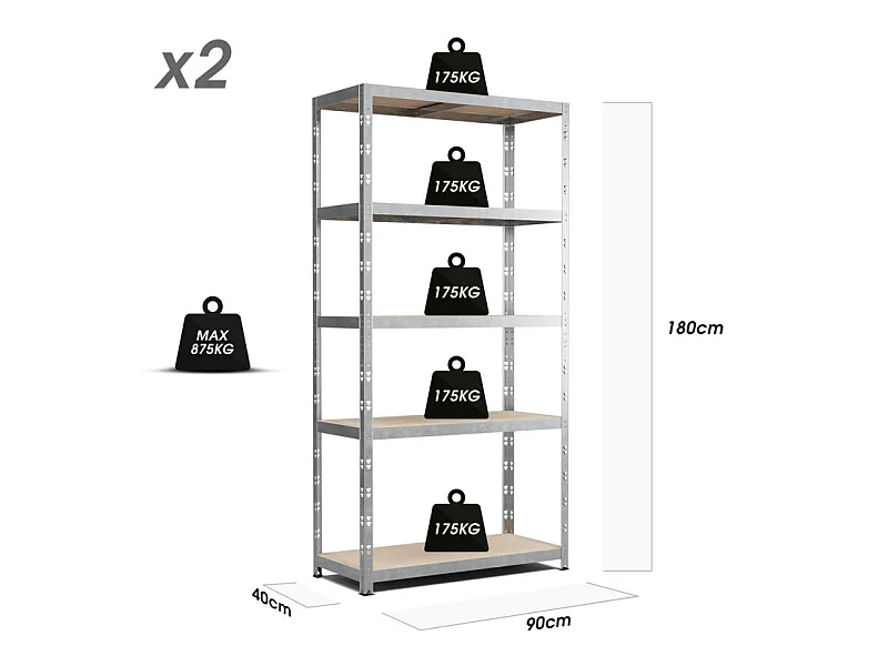 Rack en métal MDF/GALVA – 180 x 90 x 40 cm - 5 étagères - Montage facile sans boulons