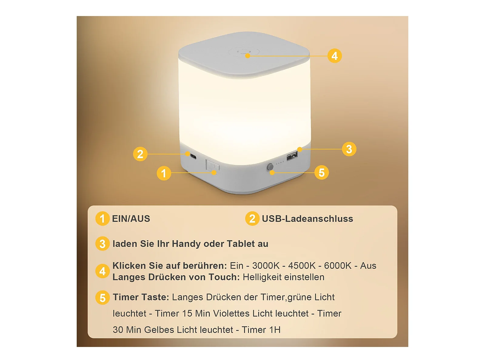 Lampe de table LED NETTLIFE à batterie 1800 mAh, tactile, dimmable 3000-6500 K USB, avec 3 températures de couleur et fonction de minuterie, veilleuse
