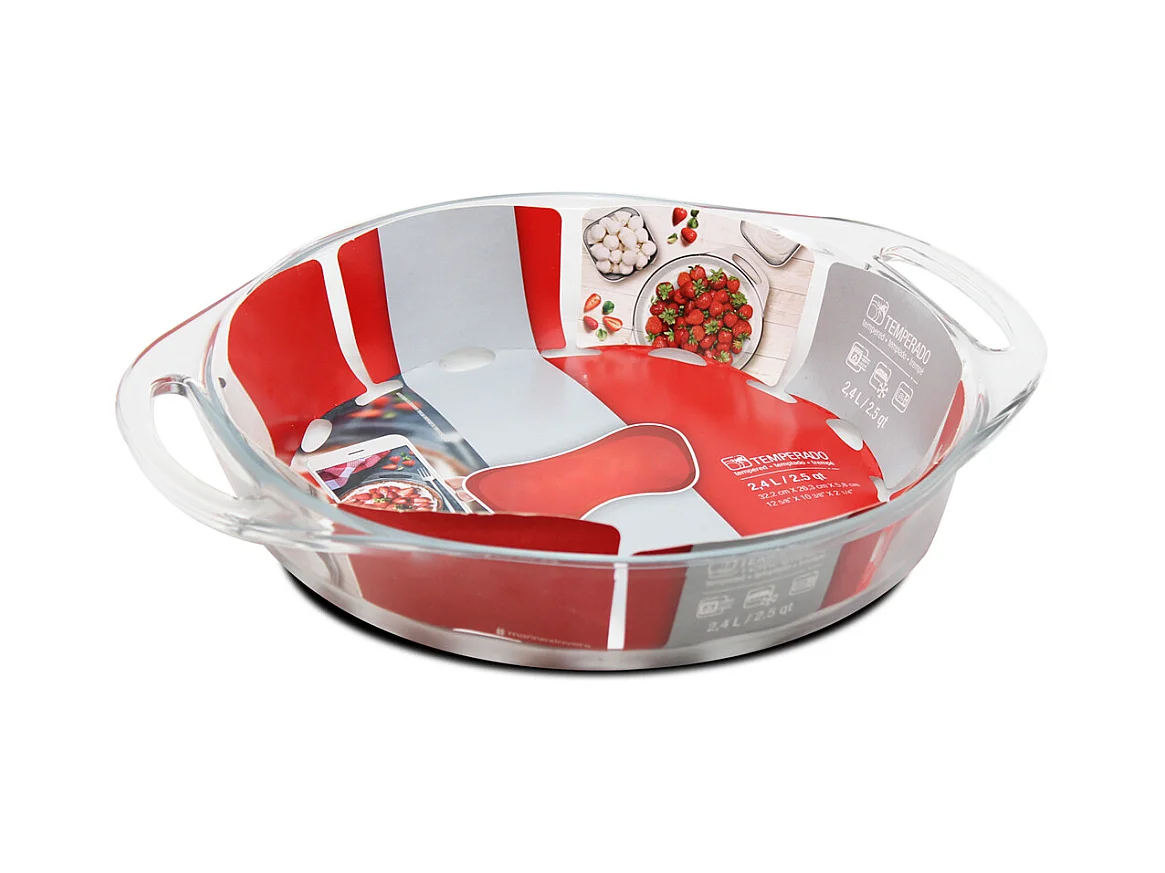Plat à four rond avec anses, moule de cuisson en verre, capacité 2.4 L - Longueur 32.2 x Profondeur 26.3 x Hauteur 5.8 cm
