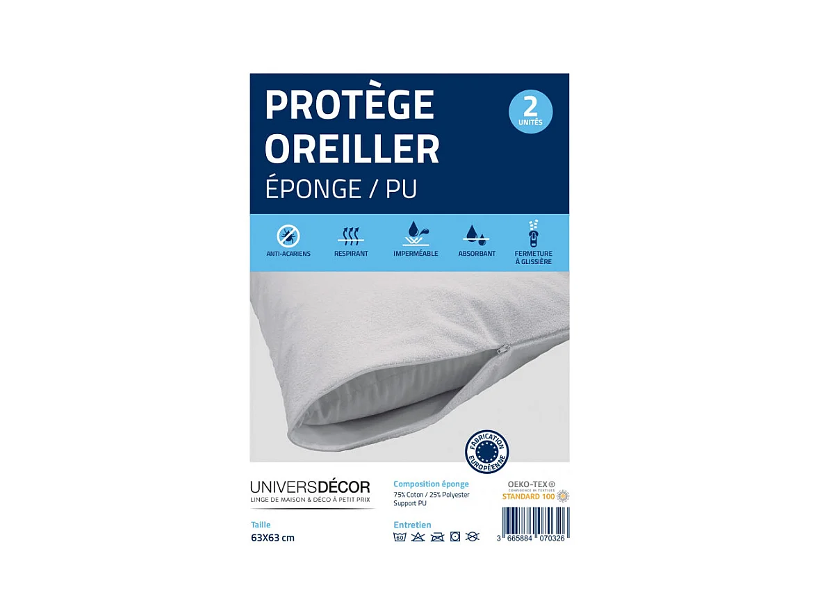 Lot de 2 protège oreiller éponge imperméable anti-acariens 63 x 63 cm