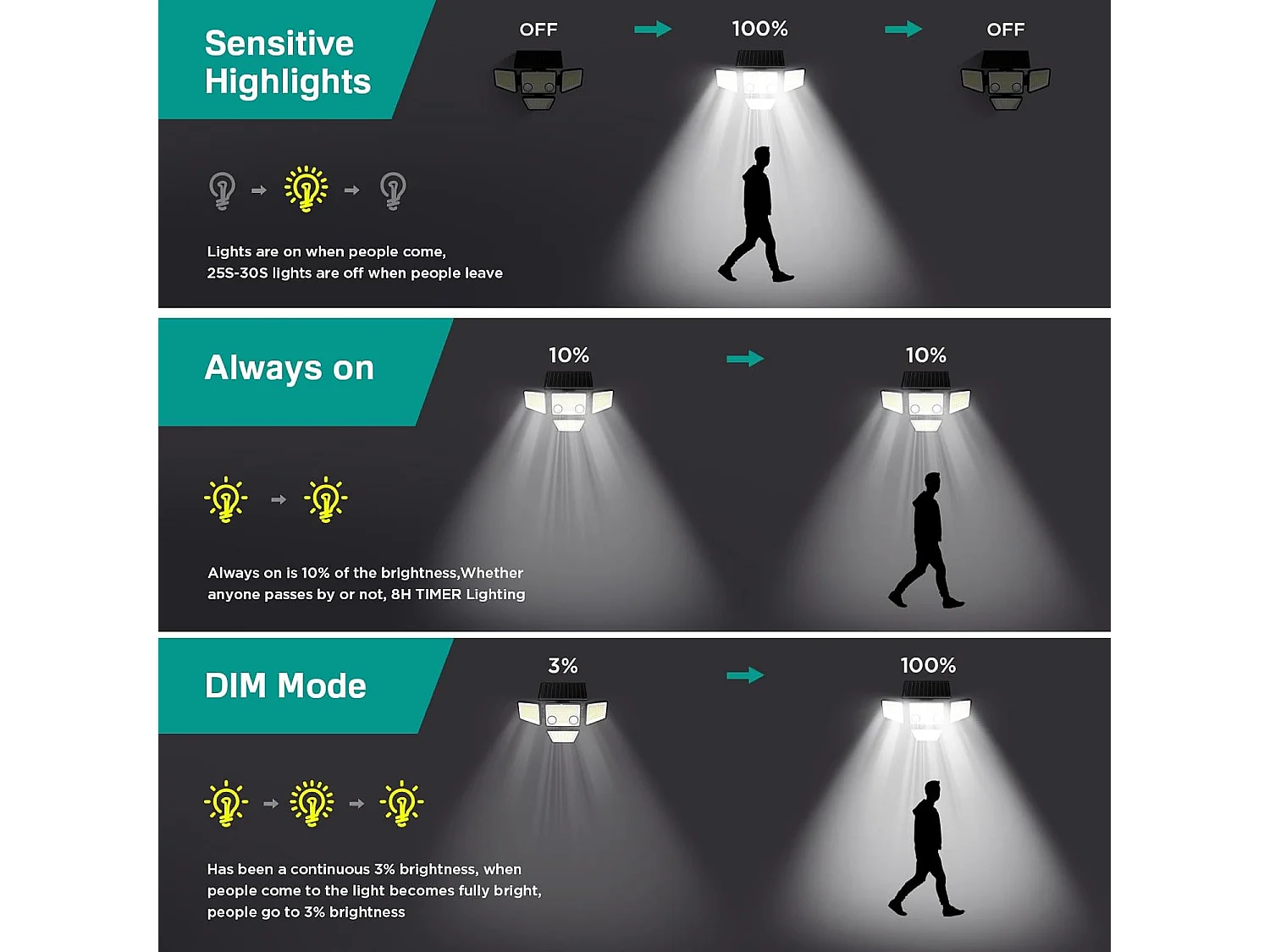 Spot solaire 3 têtes avec détecteur FALCON Noir Plastique 800LM