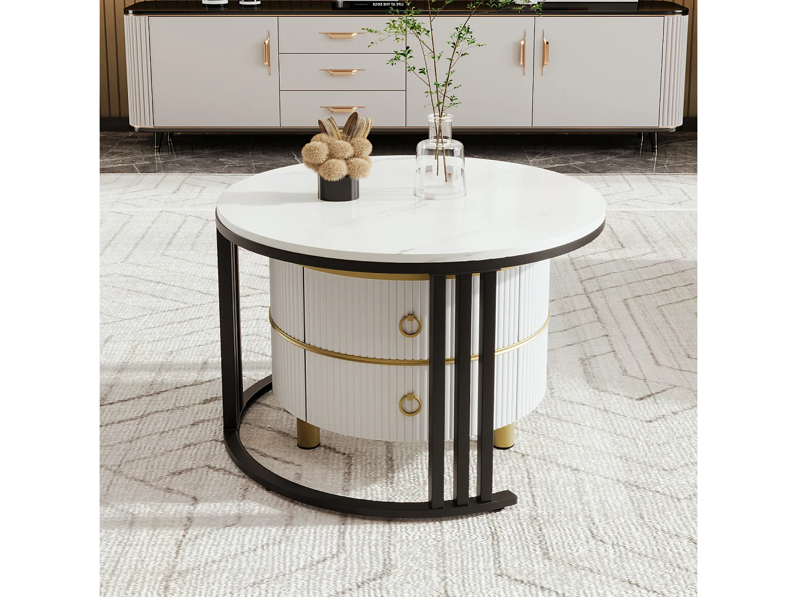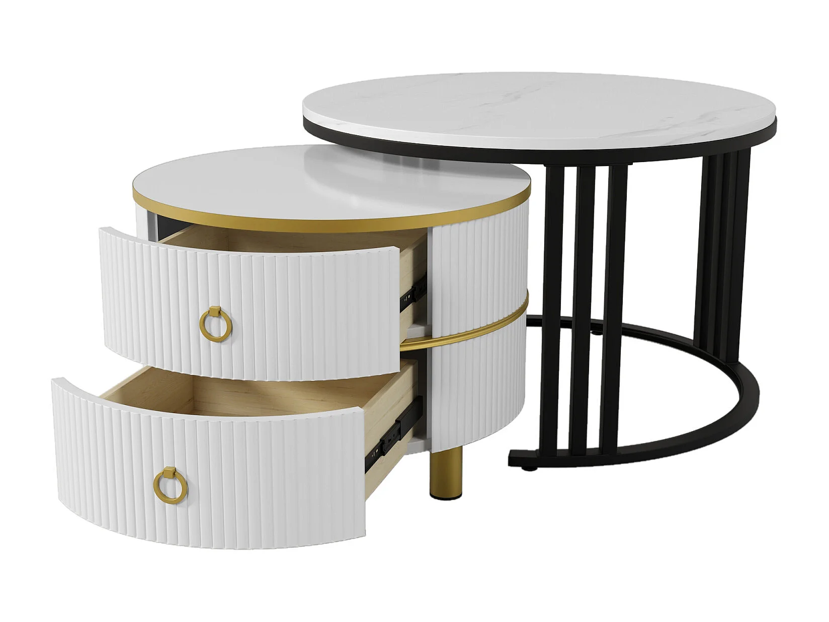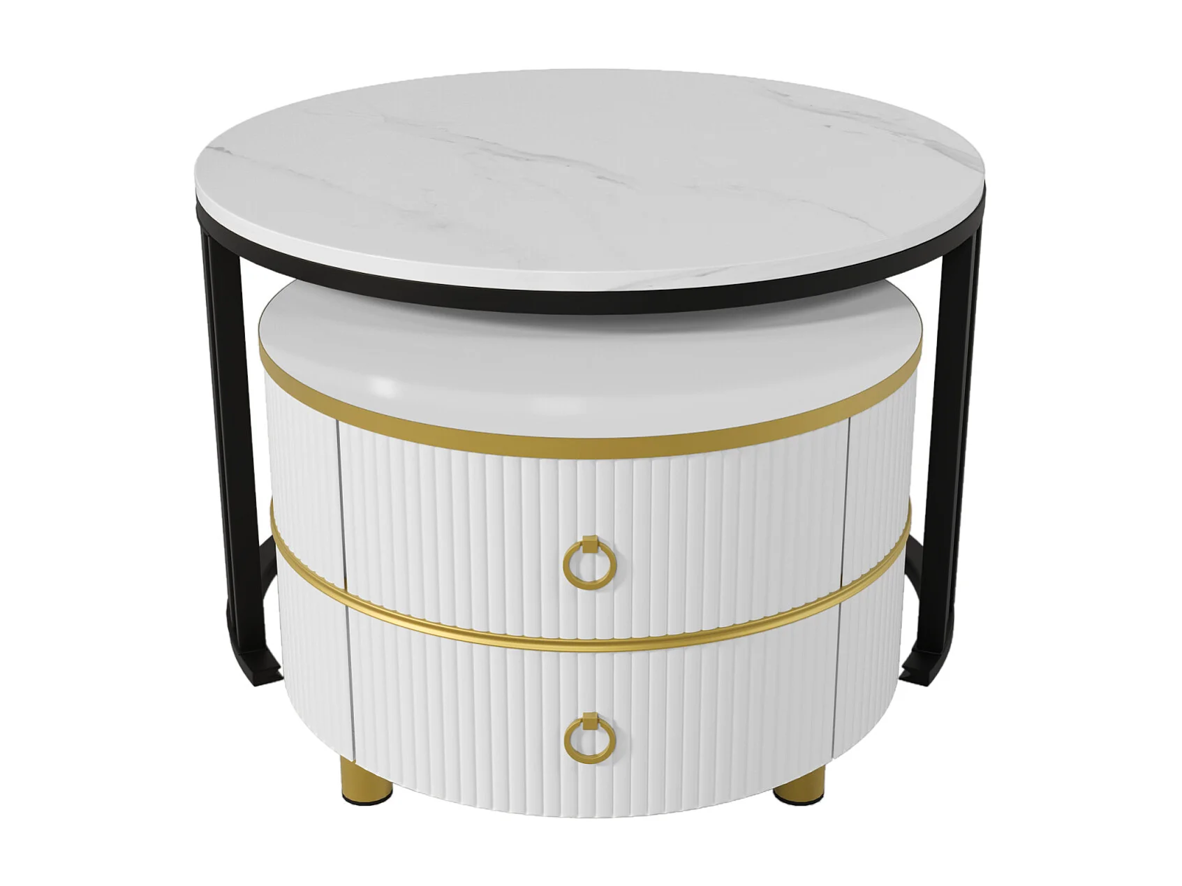 Lot de 2 Table basse gigogne ronde, 70x50 cm - avec plateau en marbre blanc, 2 tiroirs, design moderne - blanc