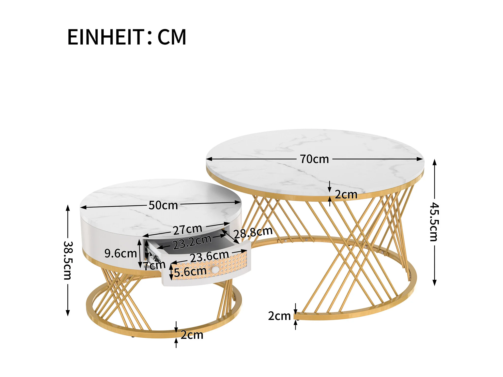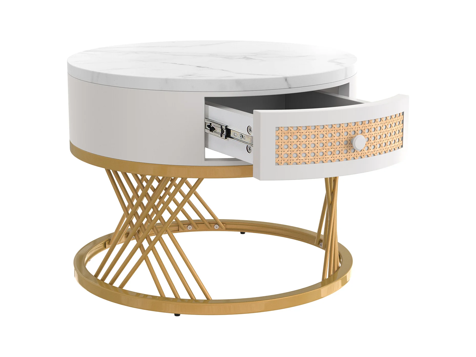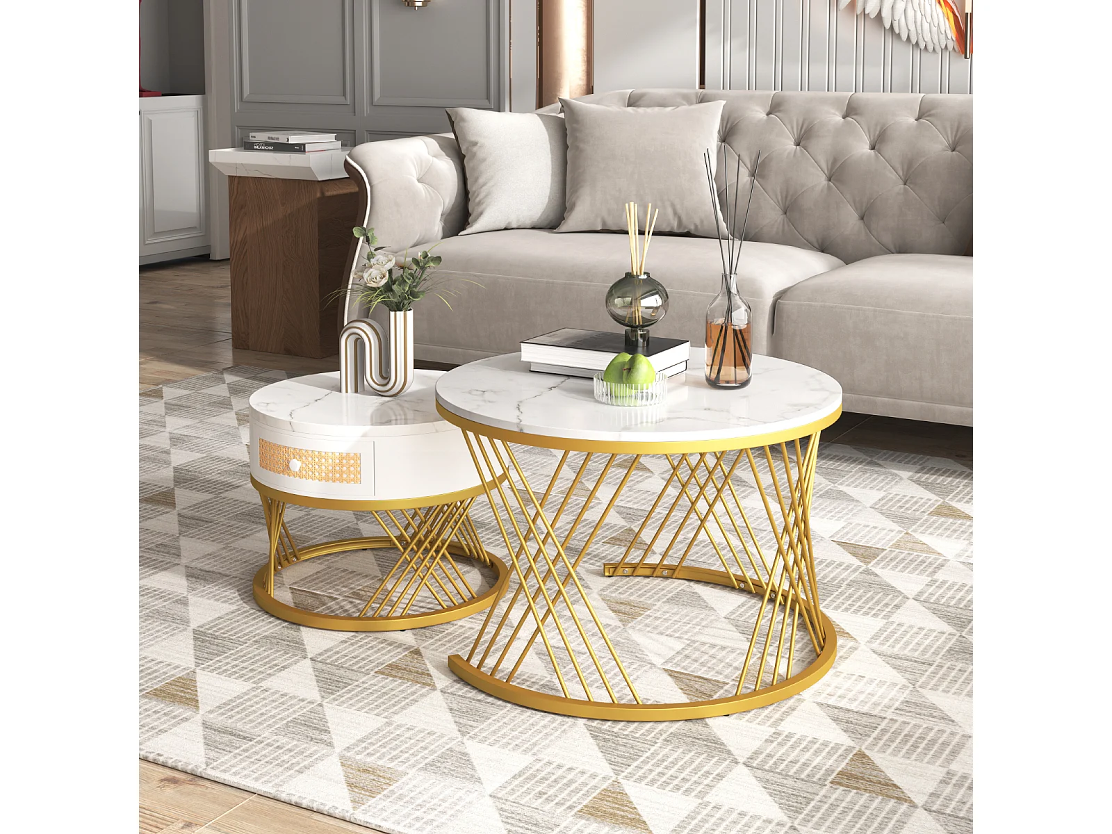 Lot de 2 table basse gigogne ronde, table d'appoint avec plateau en marbre et tiroirs en rotin, pieds en fer dorés - 70x70x45, 5+50x50x38, 5cm blanc
