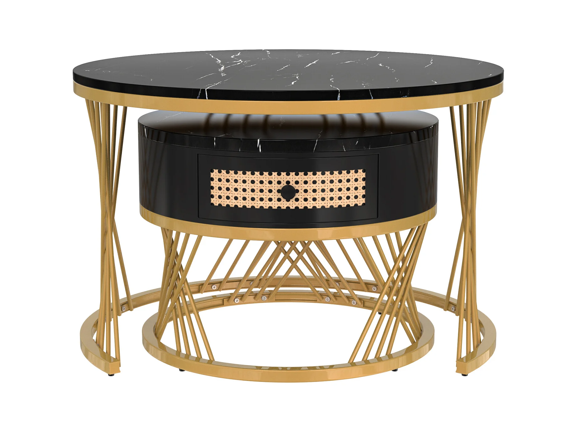 Lot de 2 table basse gigogne ronde, table d'appoint avec plateau en marbre et tiroirs en rotin, pieds en fer dorés - 70x70x45, 5+50x50x38, 5cm noir