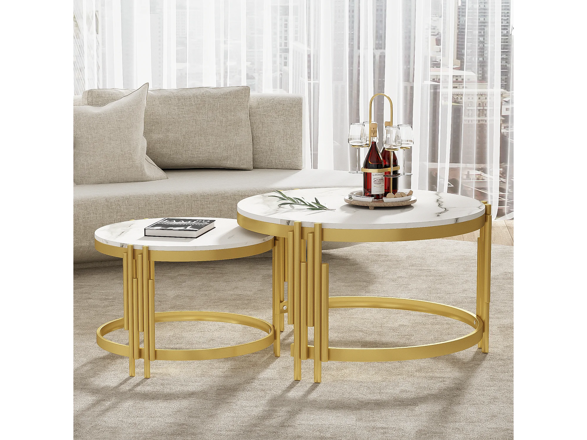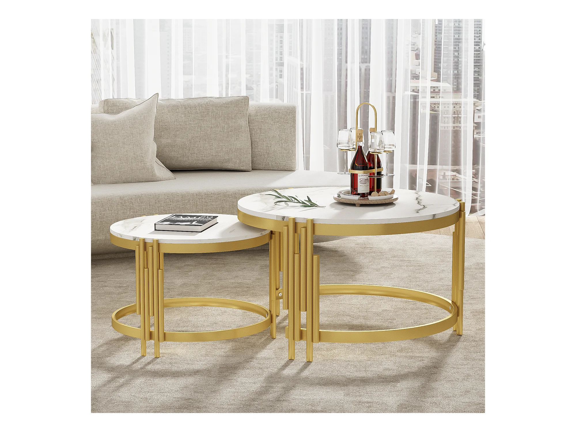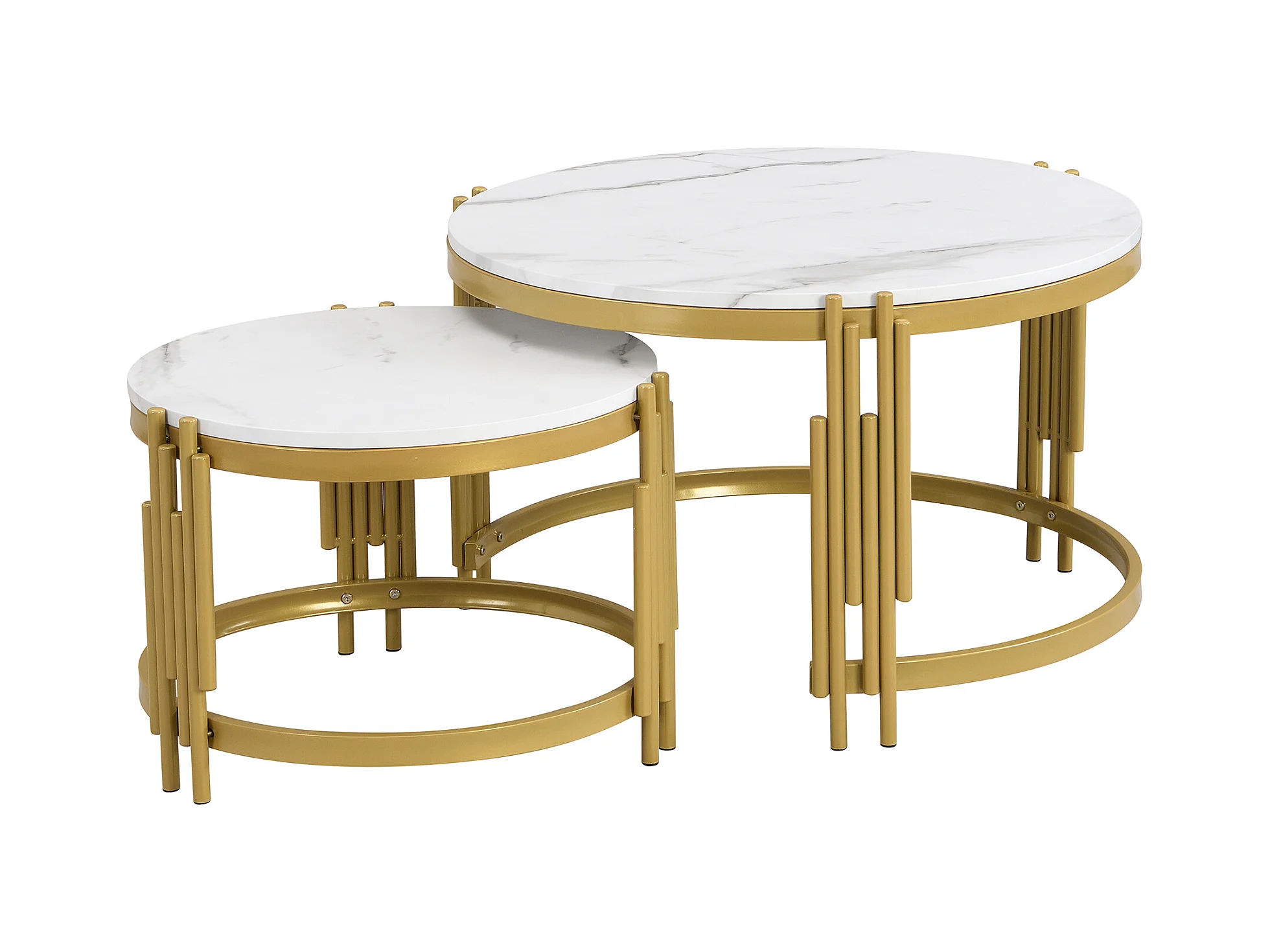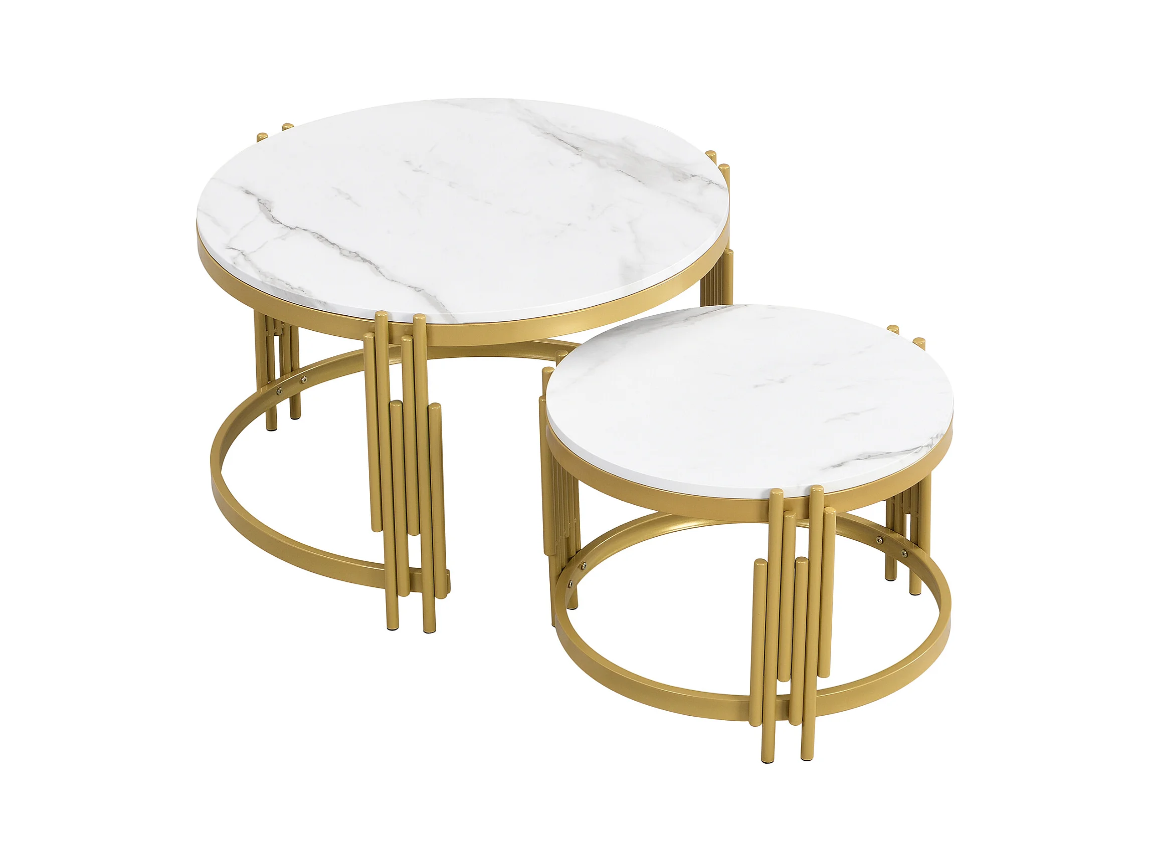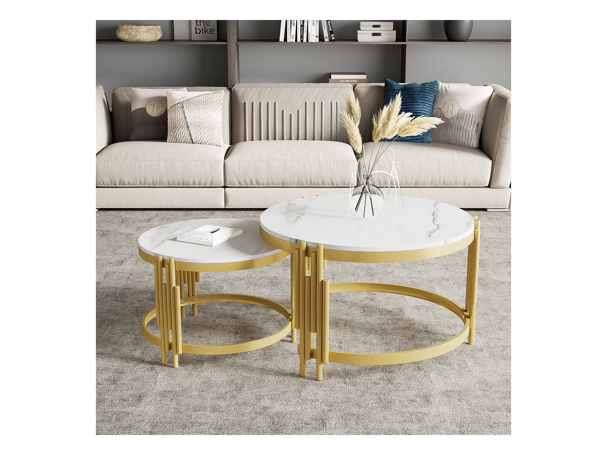 Lot de 2 table basse gigogne, table ronde, aspect marbre, structure en métal doré, D71,5x44+P51,5x37cm Blanc