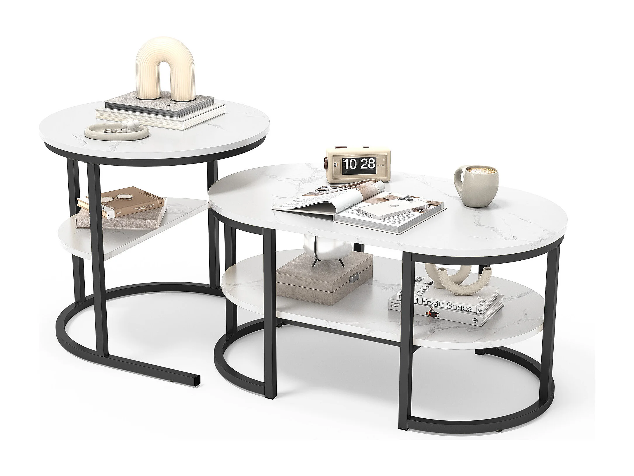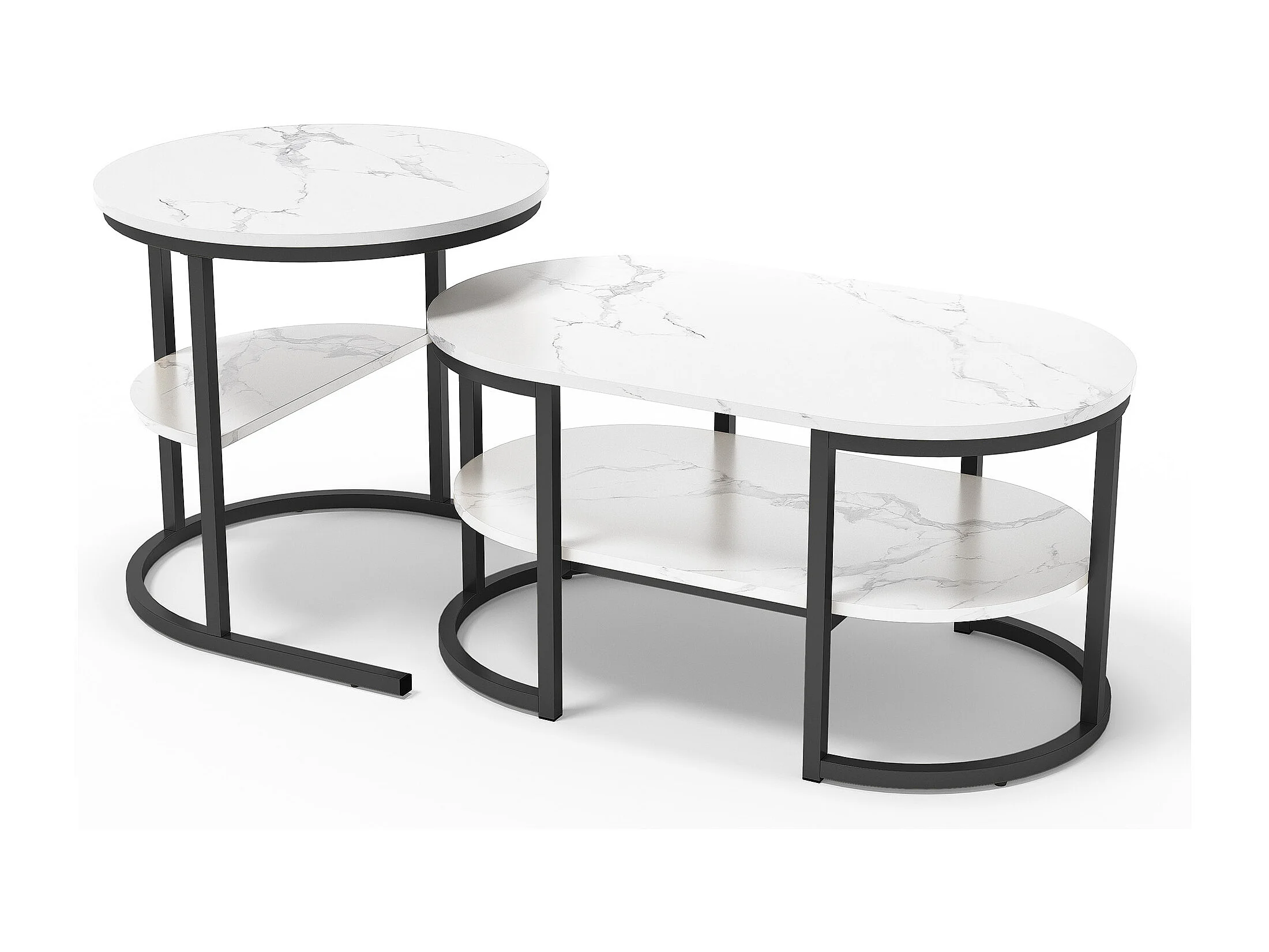 Lot de 2 tables basses - Aspect marbre - Avec cadre en métal et étagère - Table de salon moderne pour salon, chambre à coucher (ovale noir)