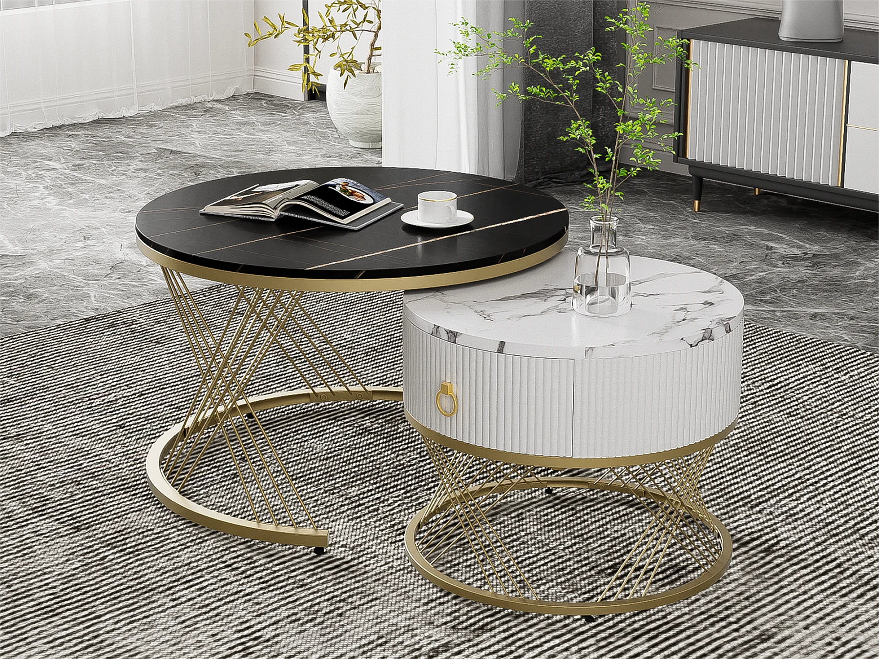 Lot de 2 tables basses avec un tiroir - plateau en MDF à motif de marbre - Noir