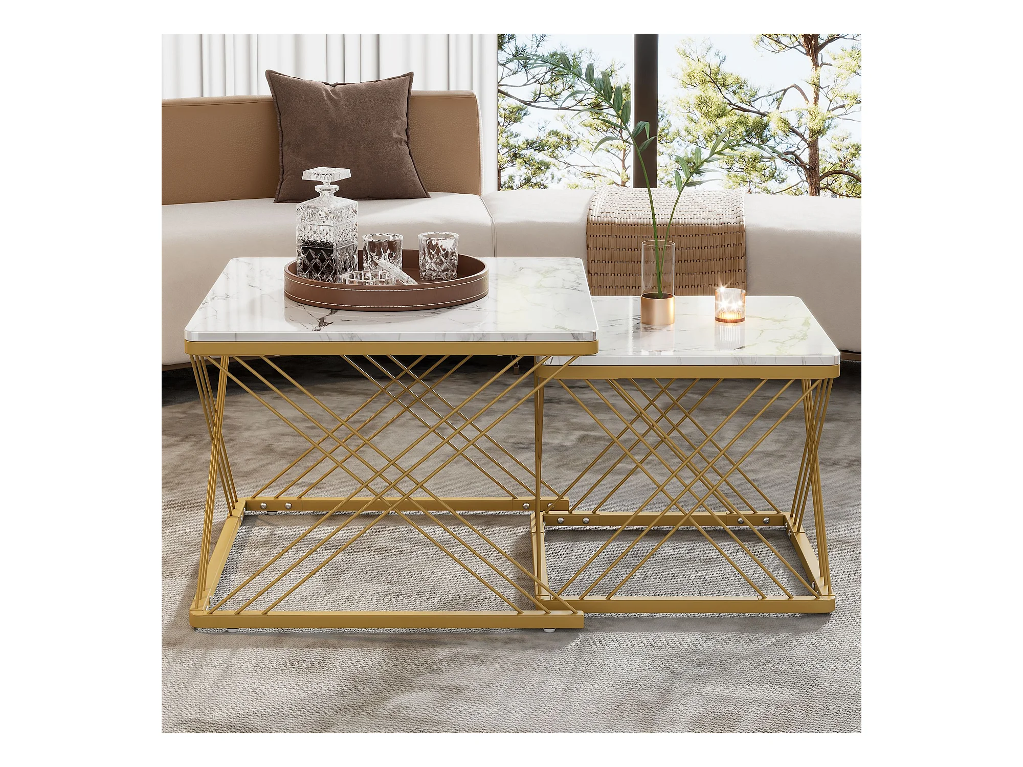 Lot de 2 tables basses gigognes carrées style art déco - acier doré panneaux aspect marbre blanc
