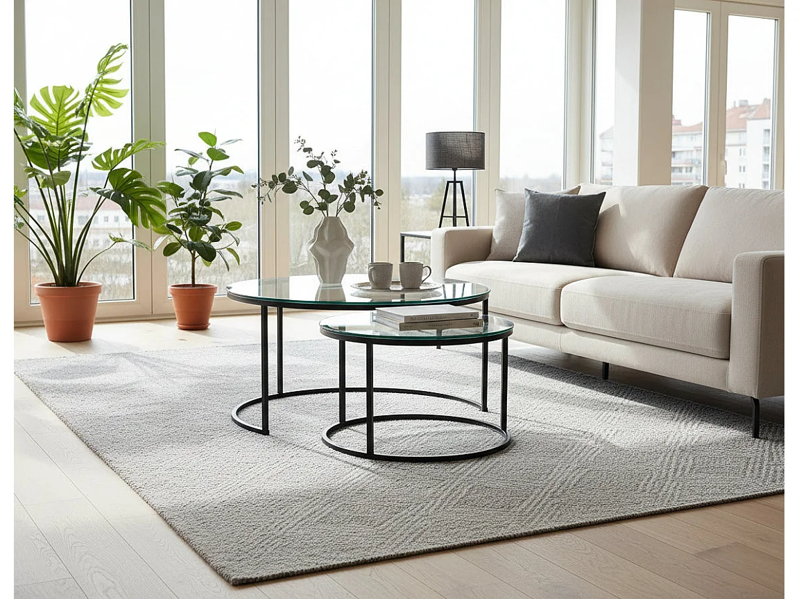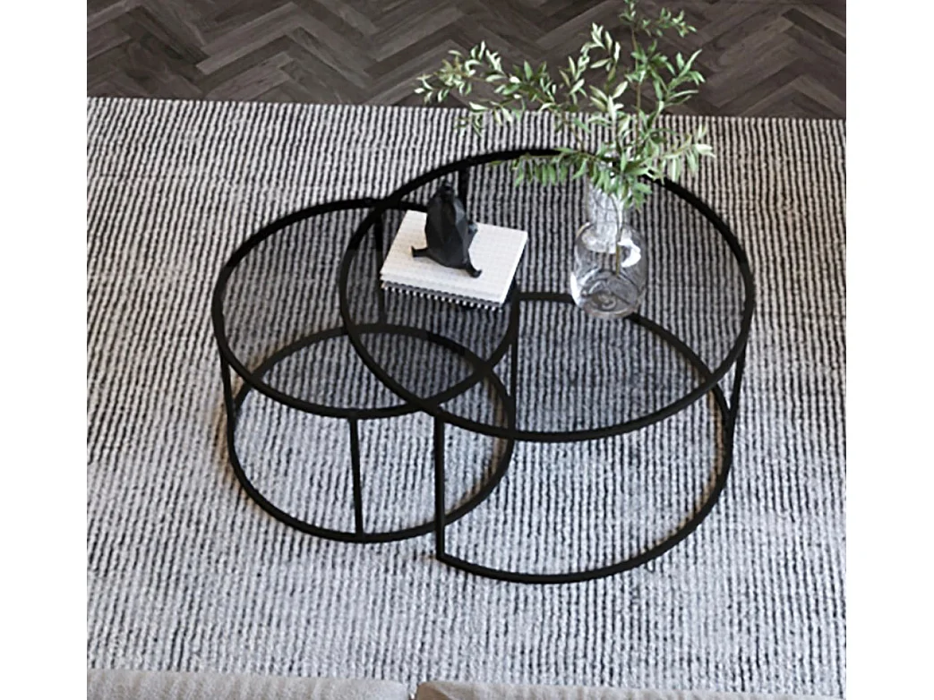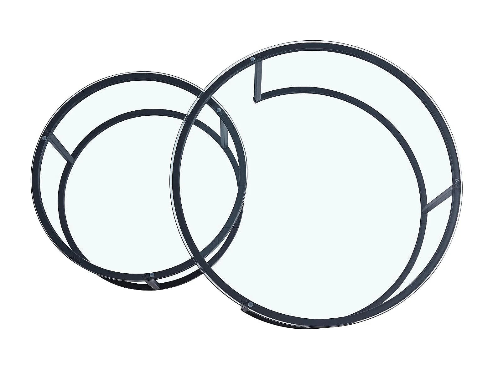 Lot 2 Tables Basses Gigognes ARTO Rondes Plateau Verre Trempé Transparent Métal Noir D80/D60