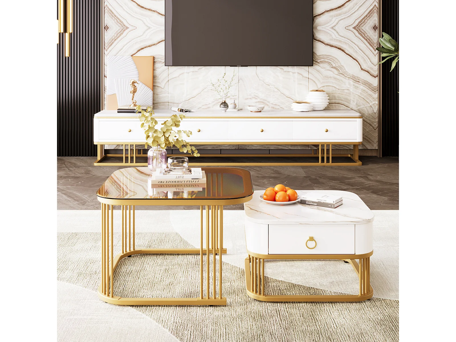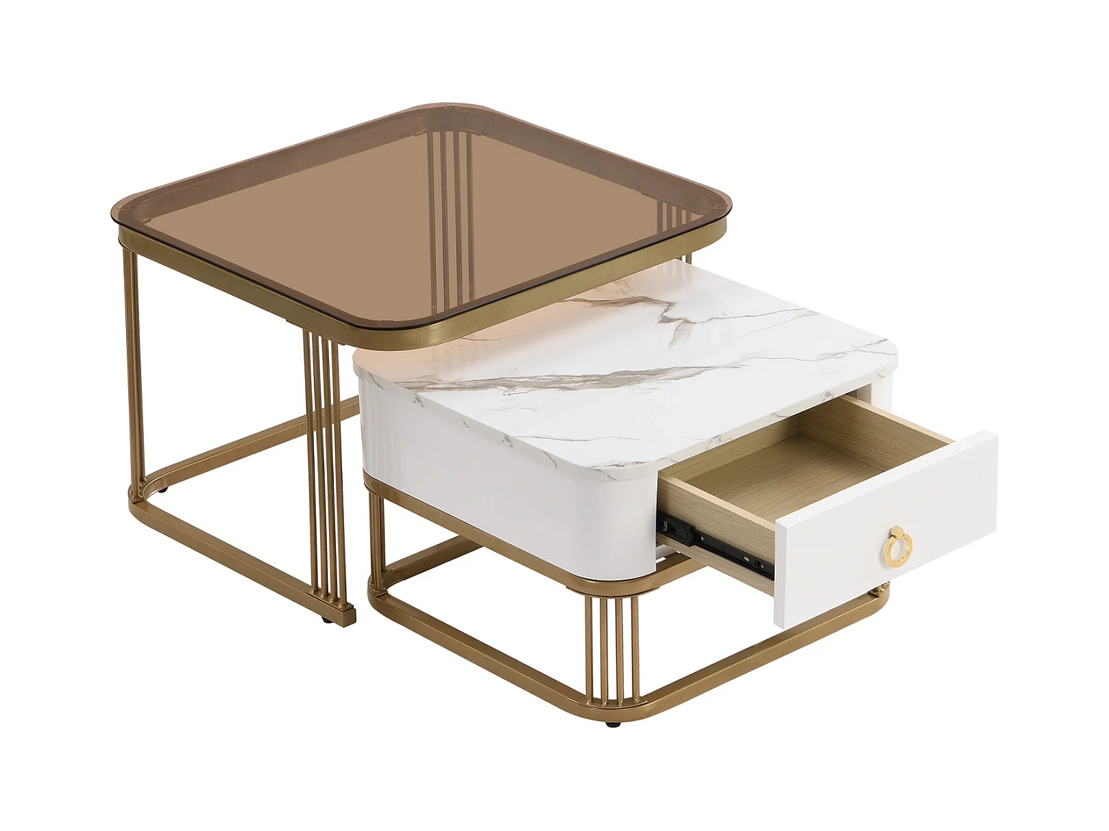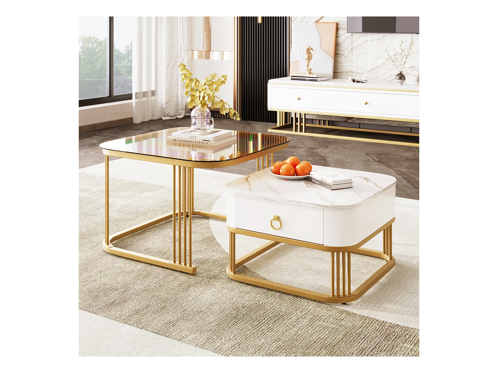 Lot de 2 tables basses gigogne, aspect marbre et plateau en verre, accents dorés, avec 1 tiroir, 60x60x45cm+50x50x34cm, blanc