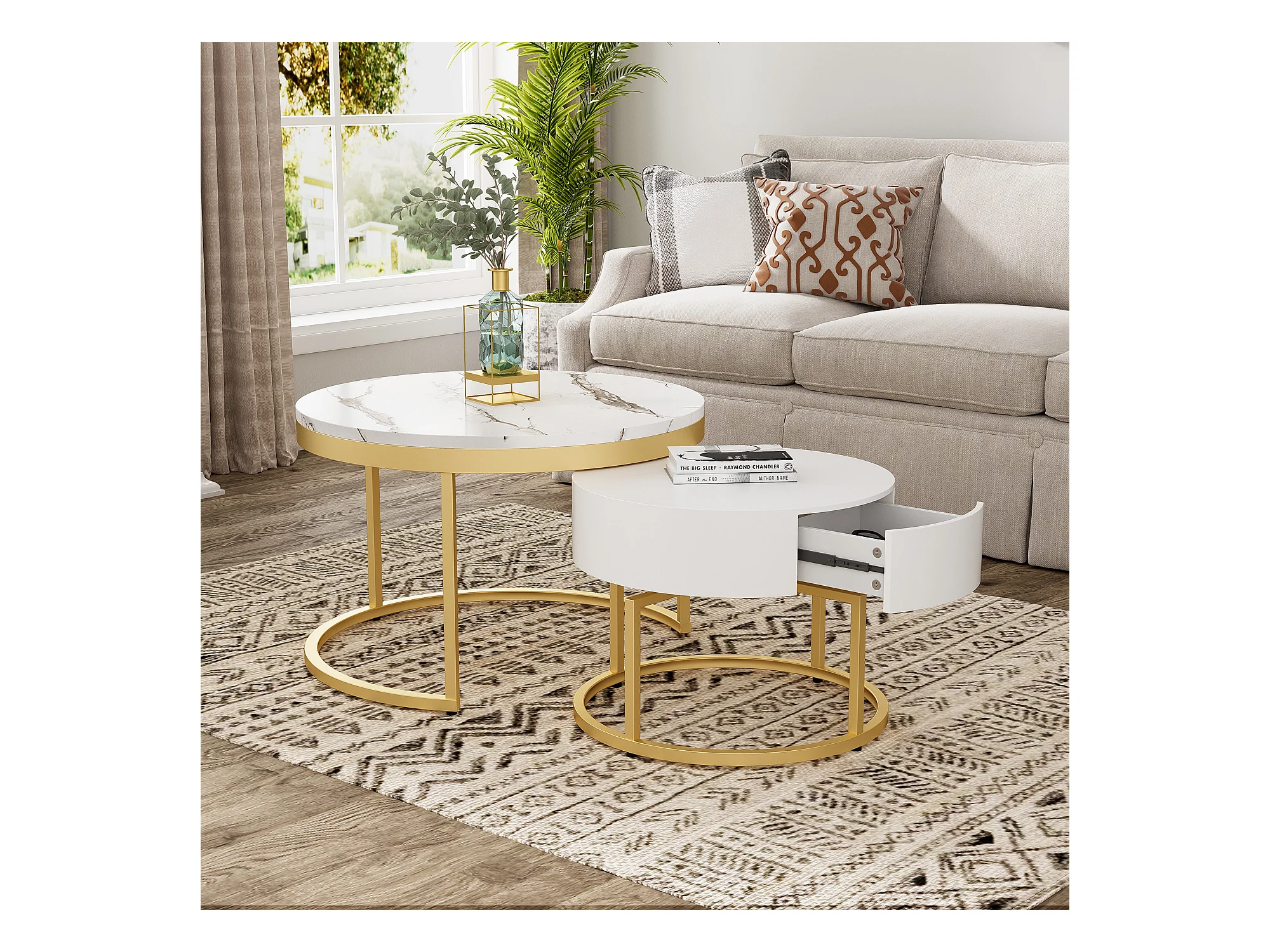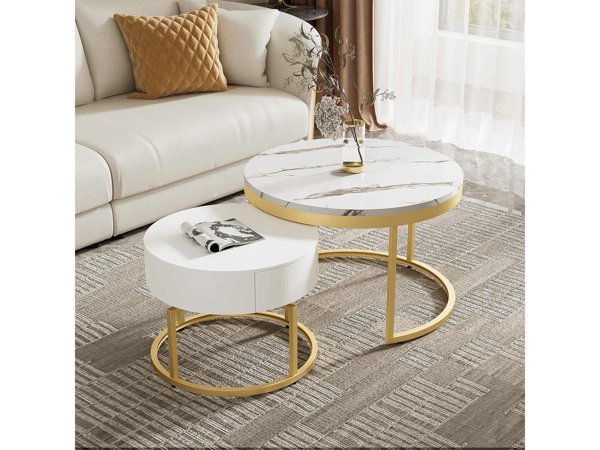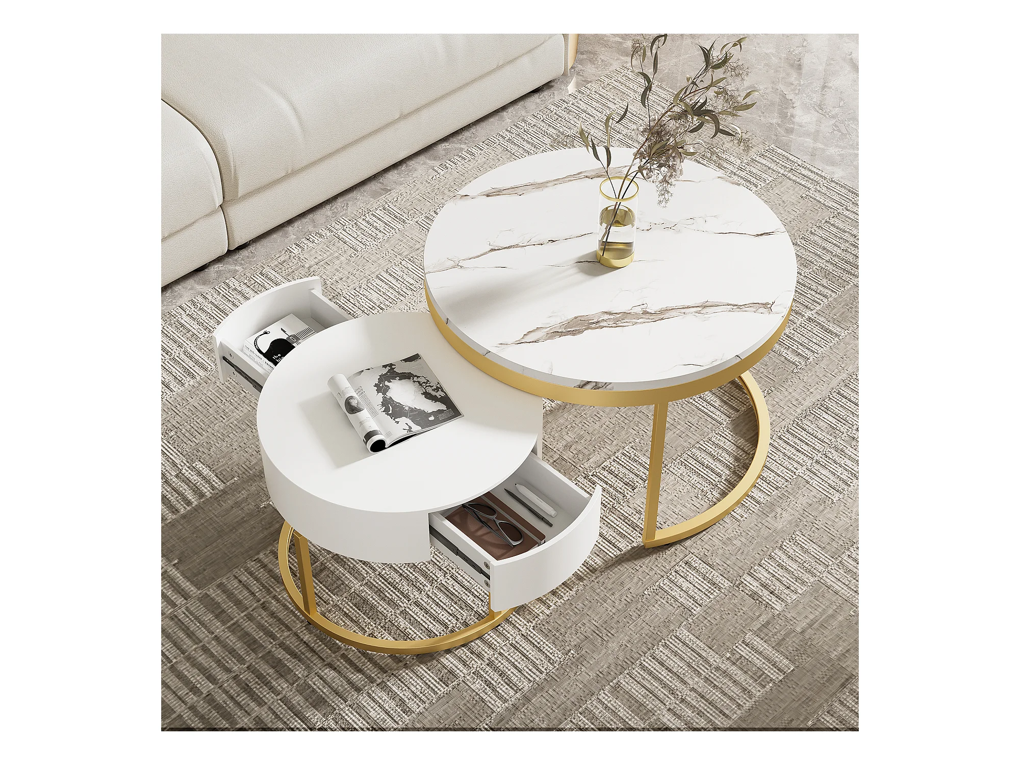 Lot de 2 tables basses gigognes avec 2 tiroirs - Motif de Marbre - bois MDF - Blanc