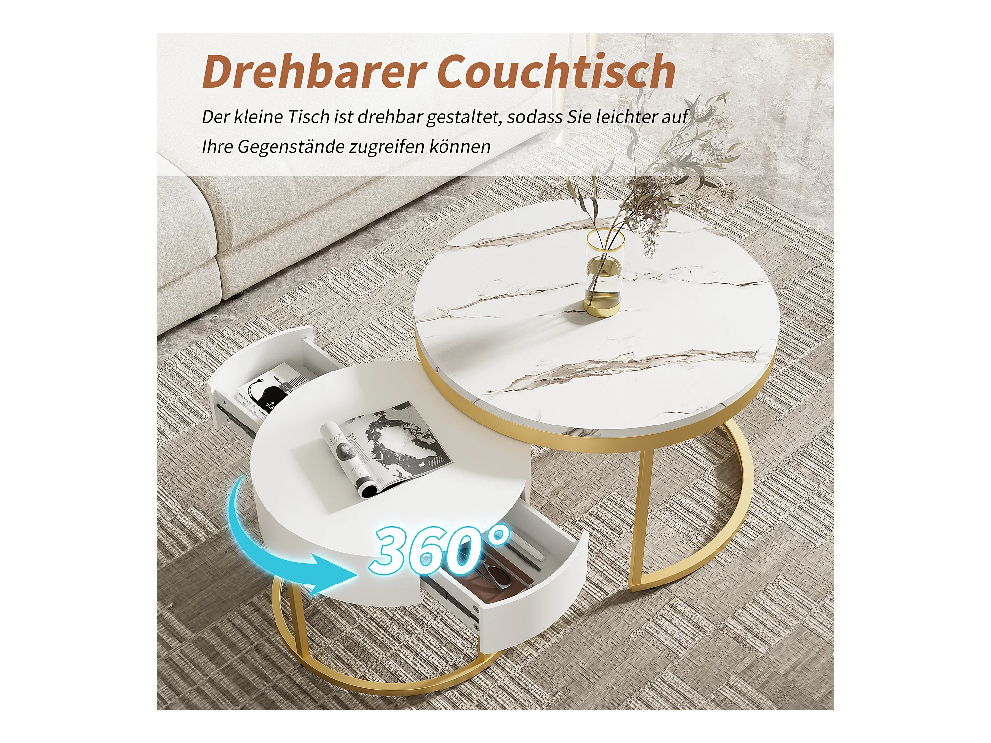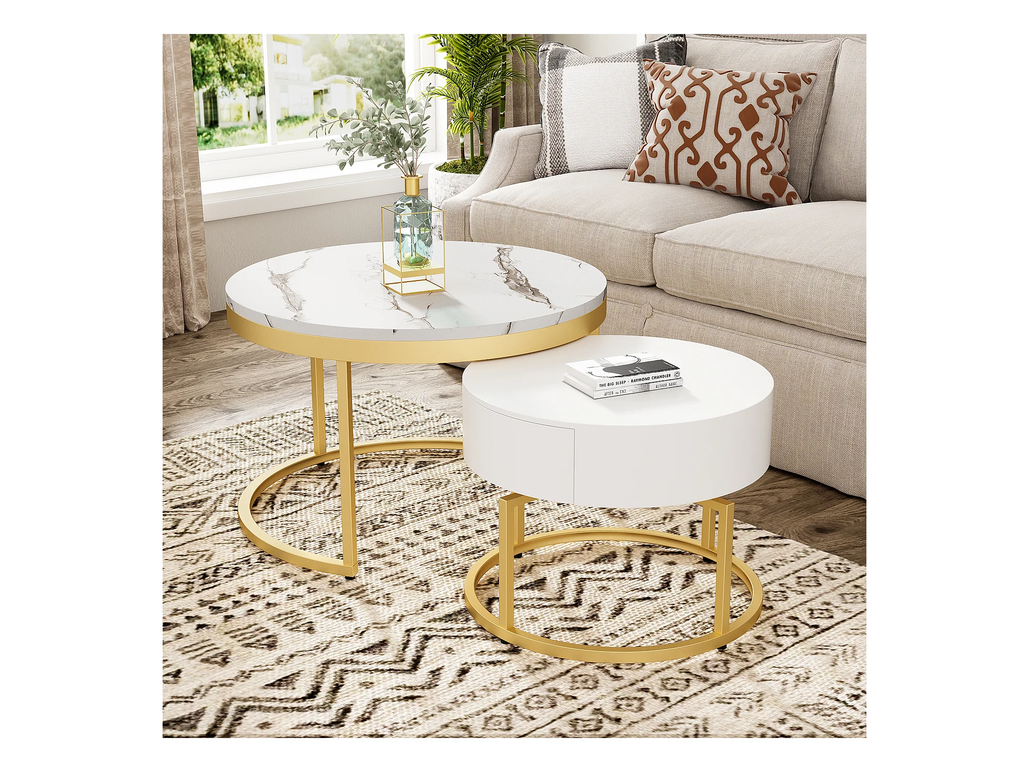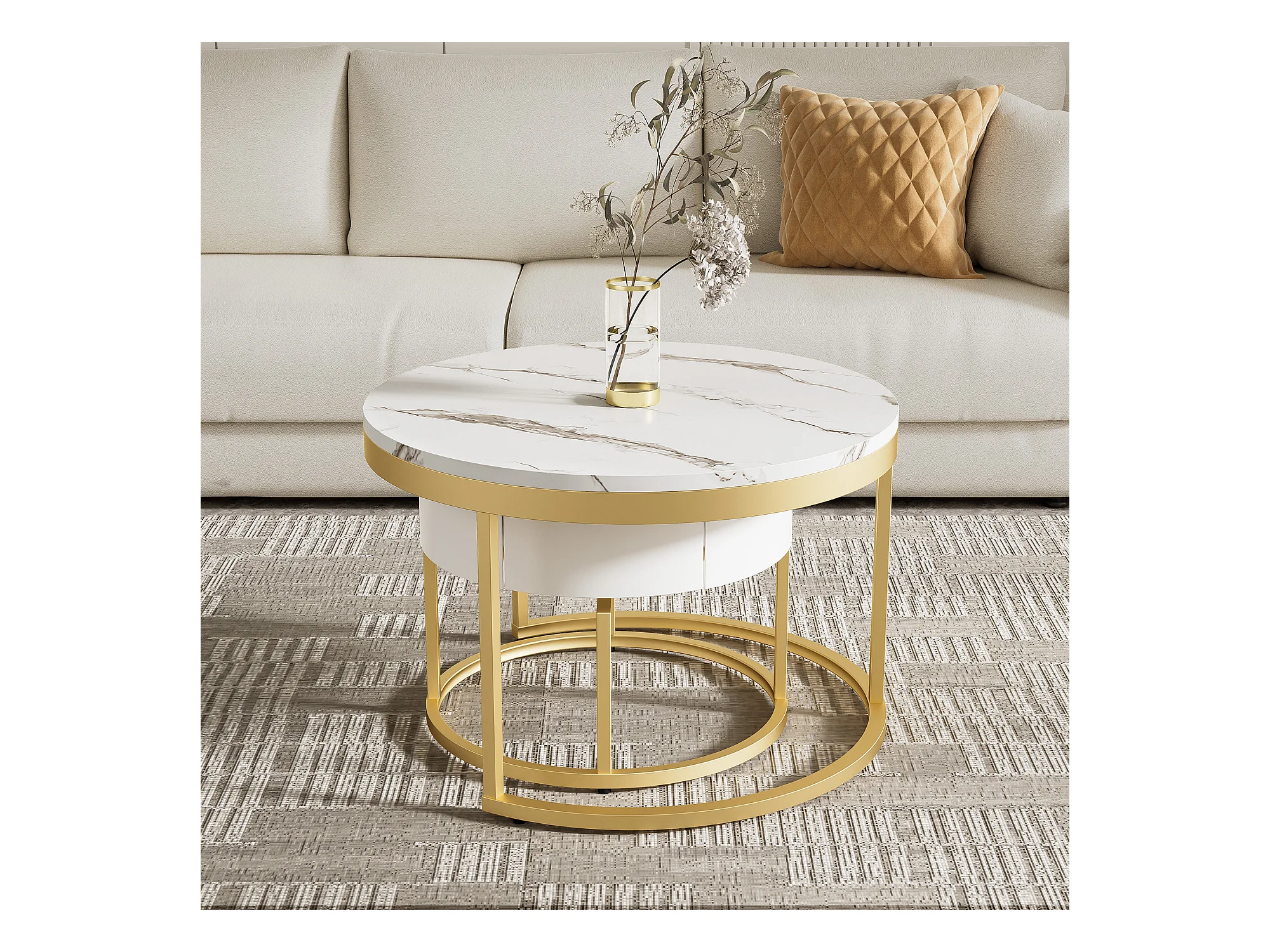 Lot de 2 tables basses gigognes avec 2 tiroirs - Motif de Marbre - bois MDF - Blanc