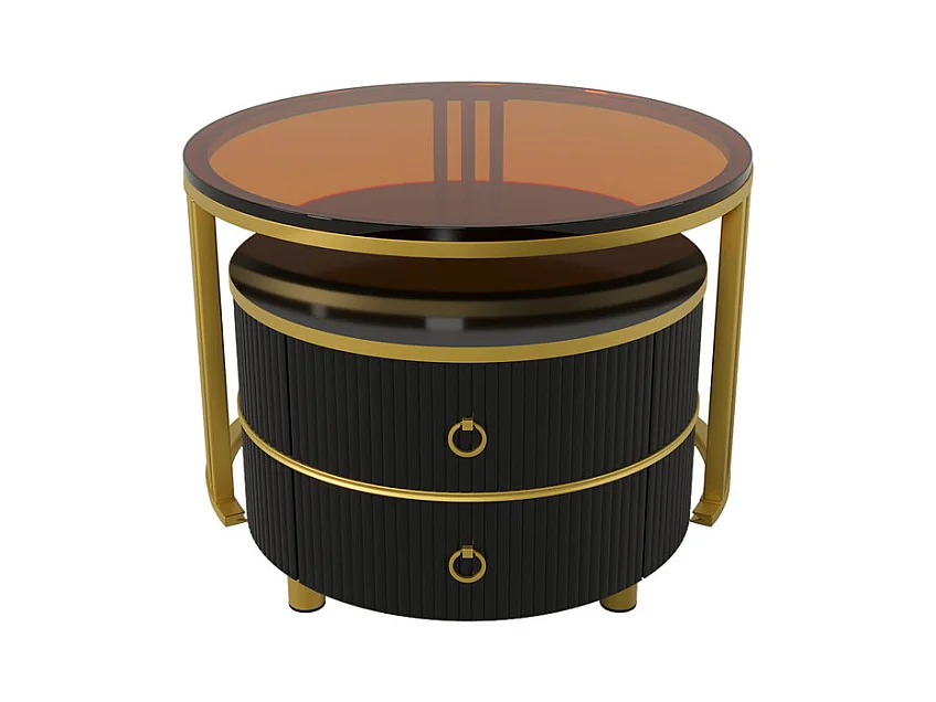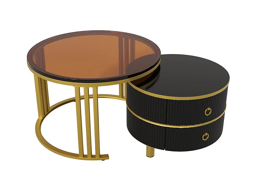 Lot de 2 tables basses gigognes avec 2 tiroirs - plateau en verre trempé Marron - Noir