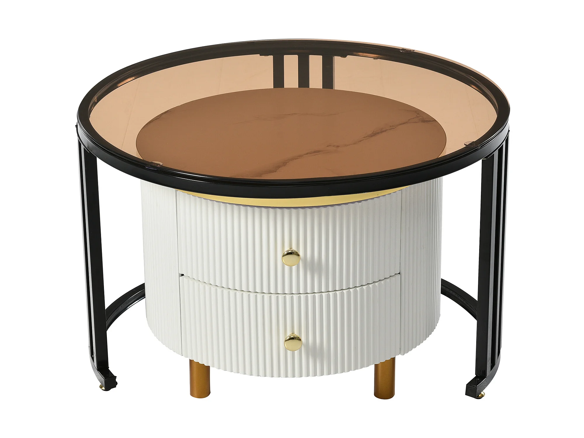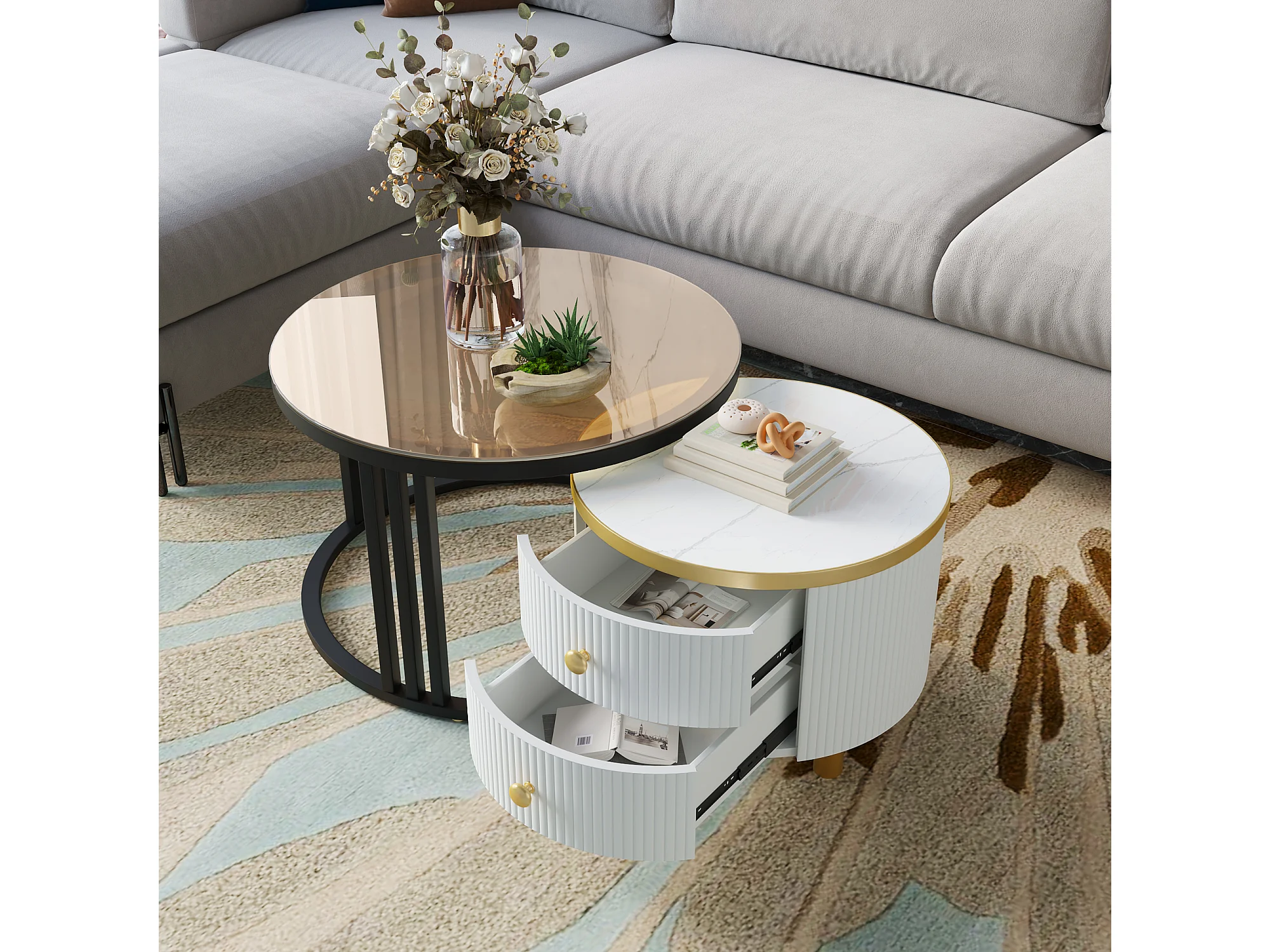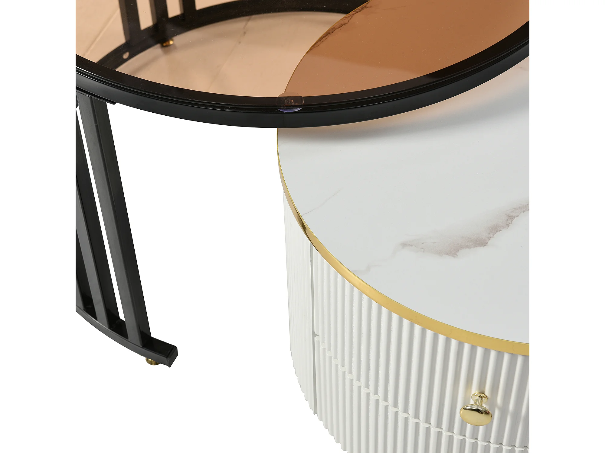 Lot de 2 tables basses gigognes avec 2 tiroirs - plateaux en verre trempé - Doré & Blanc