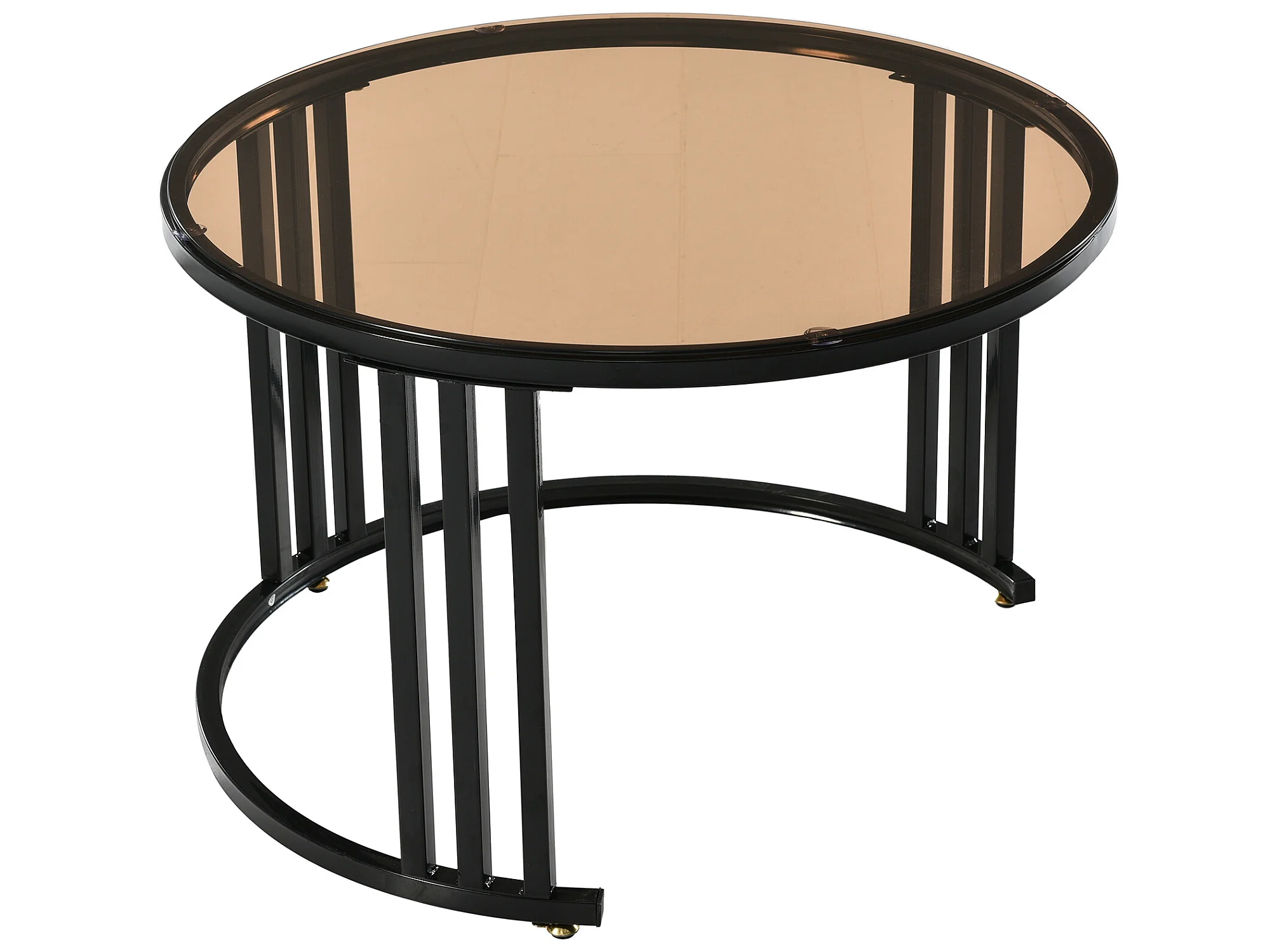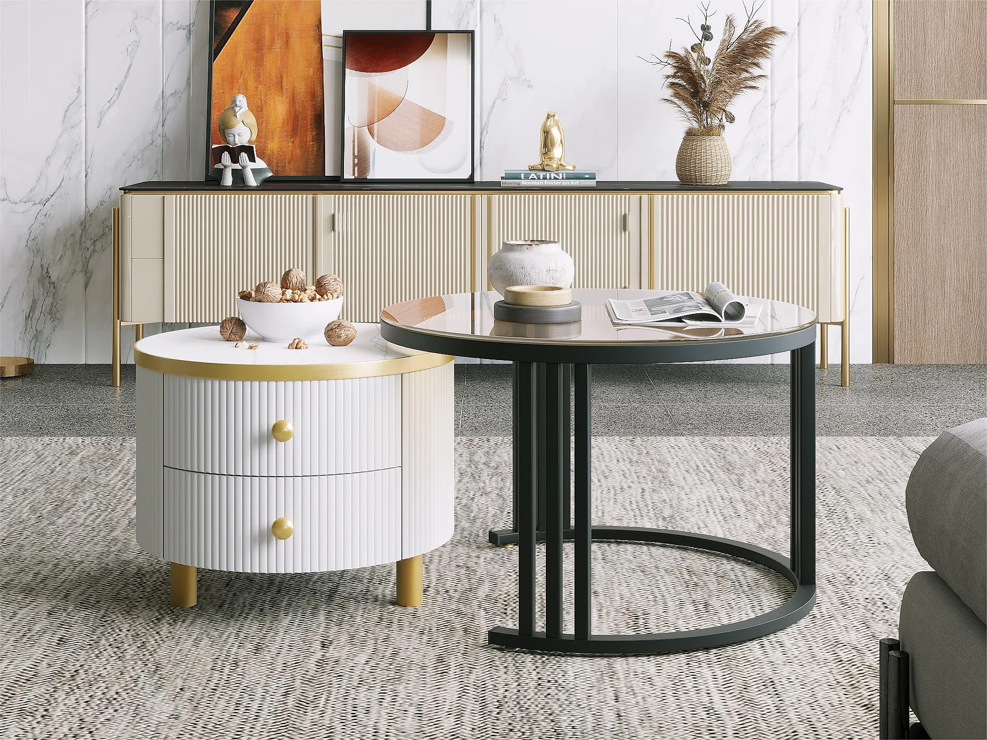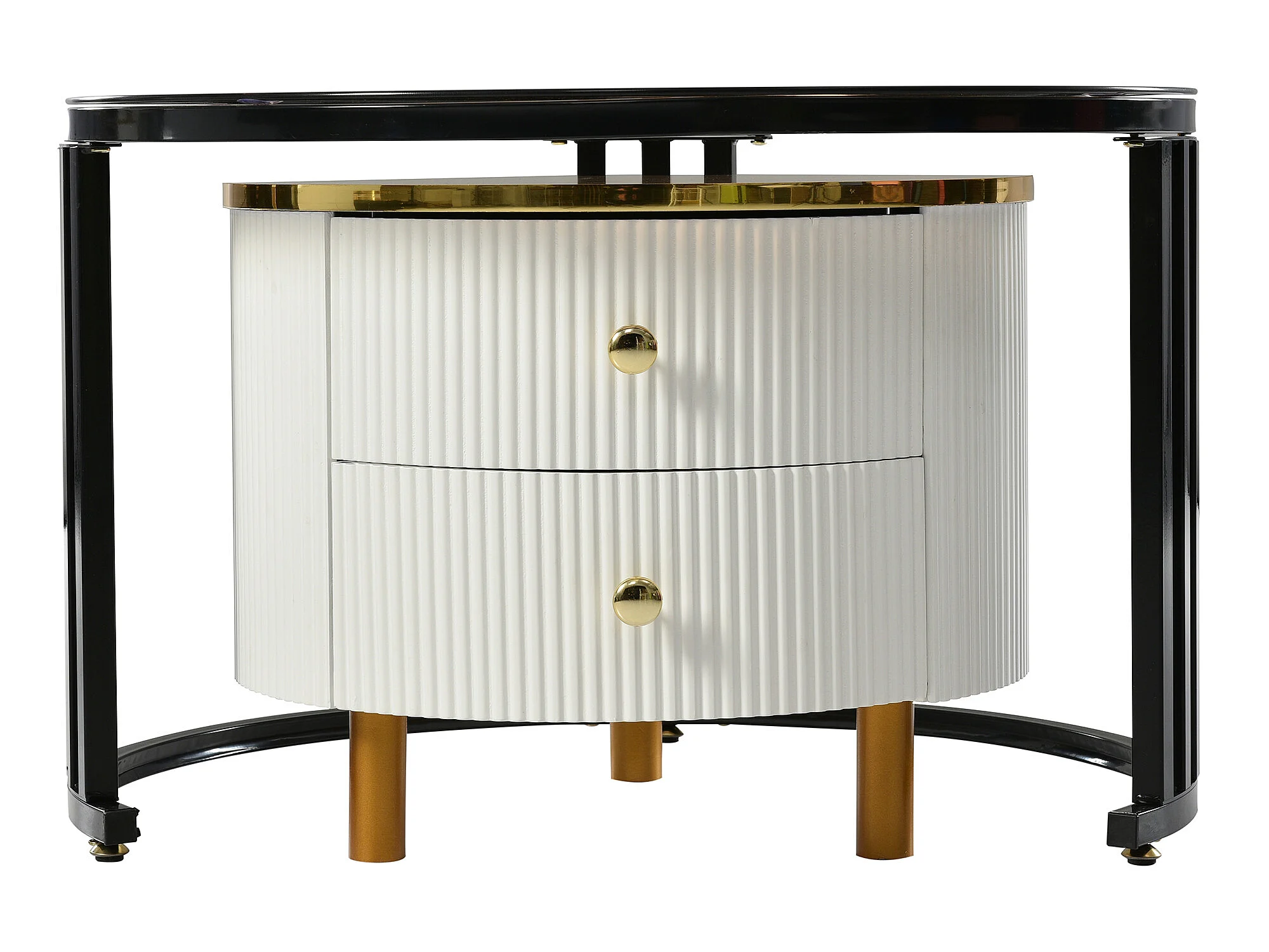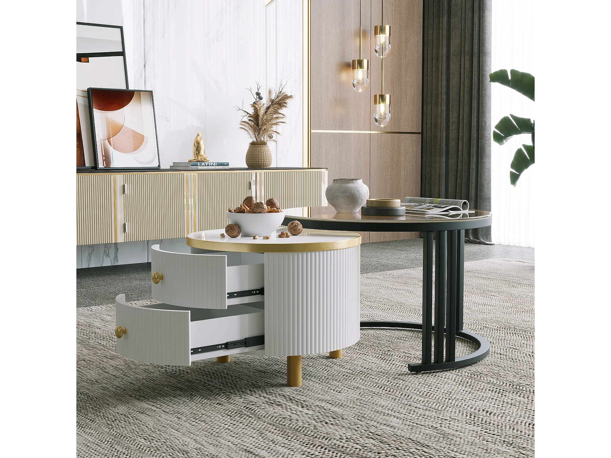 Lot de 2 tables basses gigognes avec 2 tiroirs - plateaux en verre trempé - Doré & Blanc