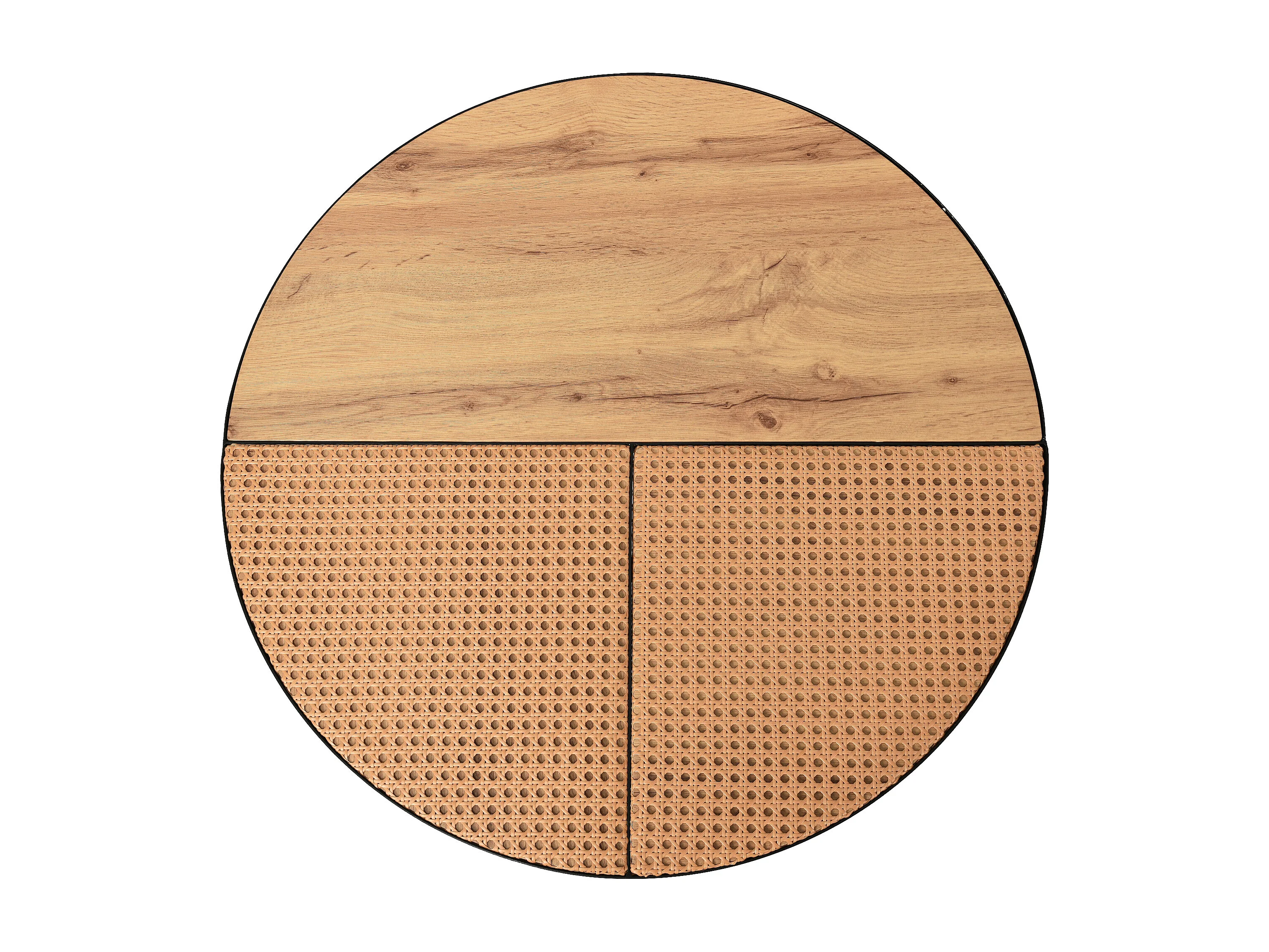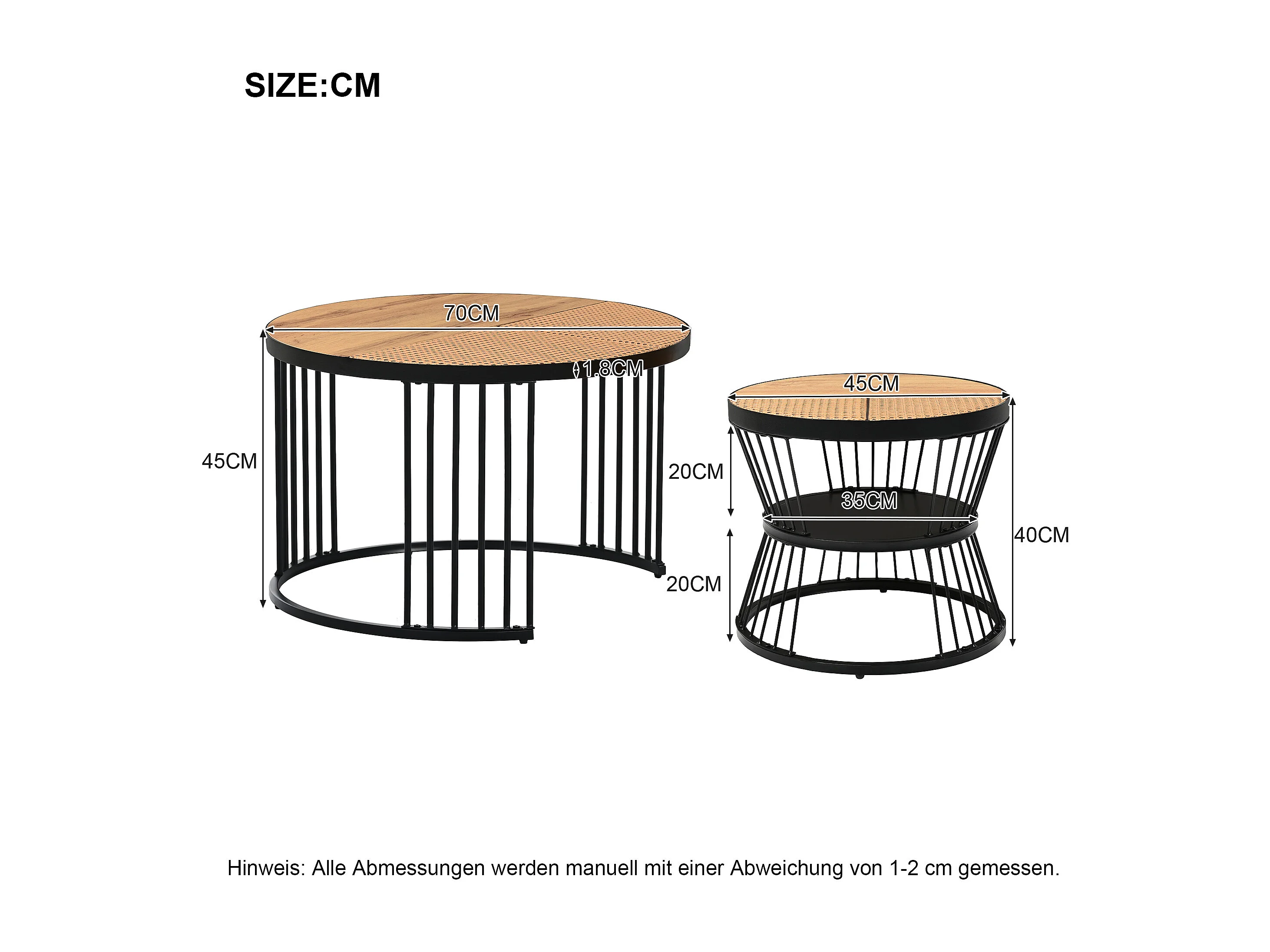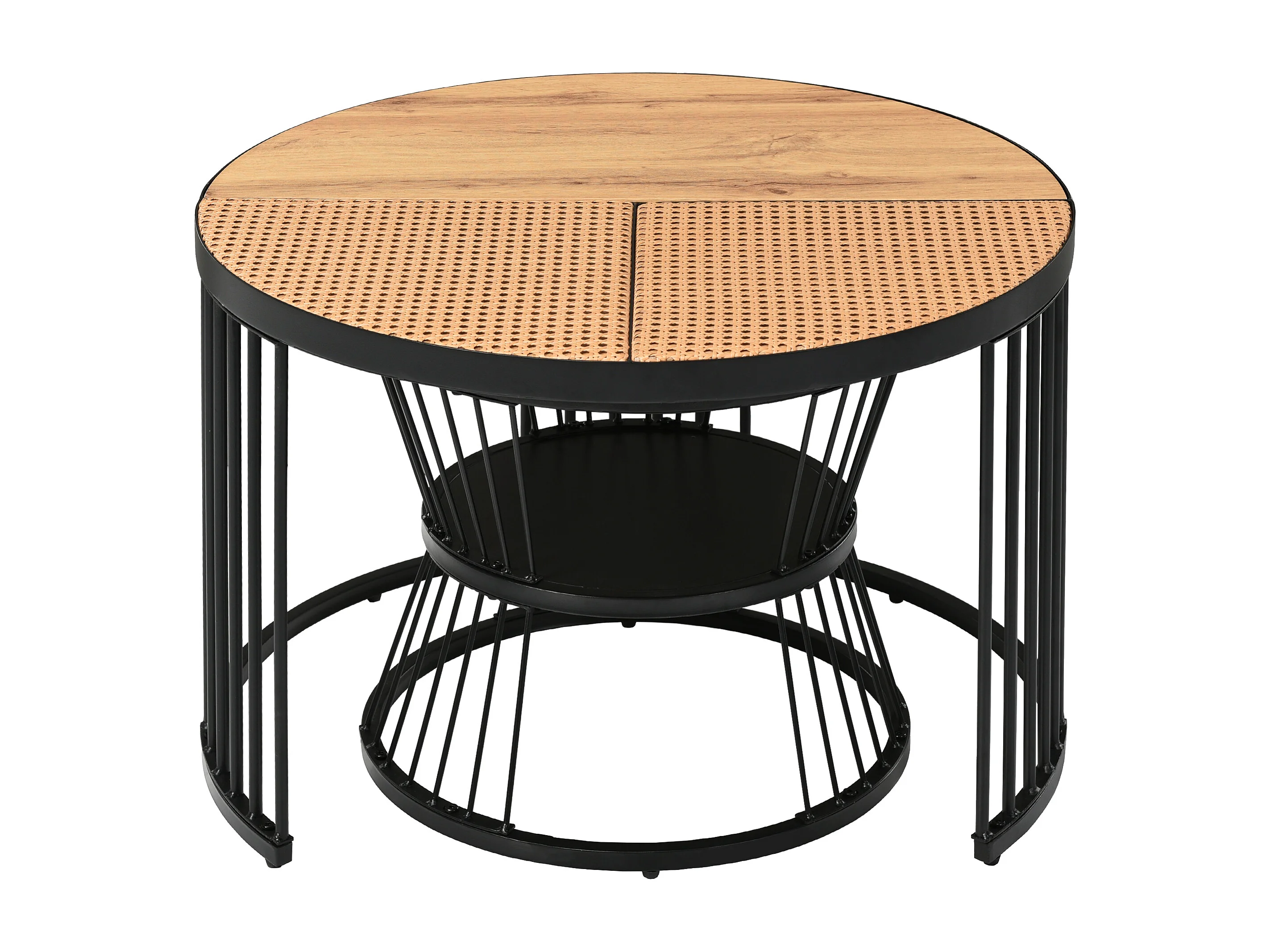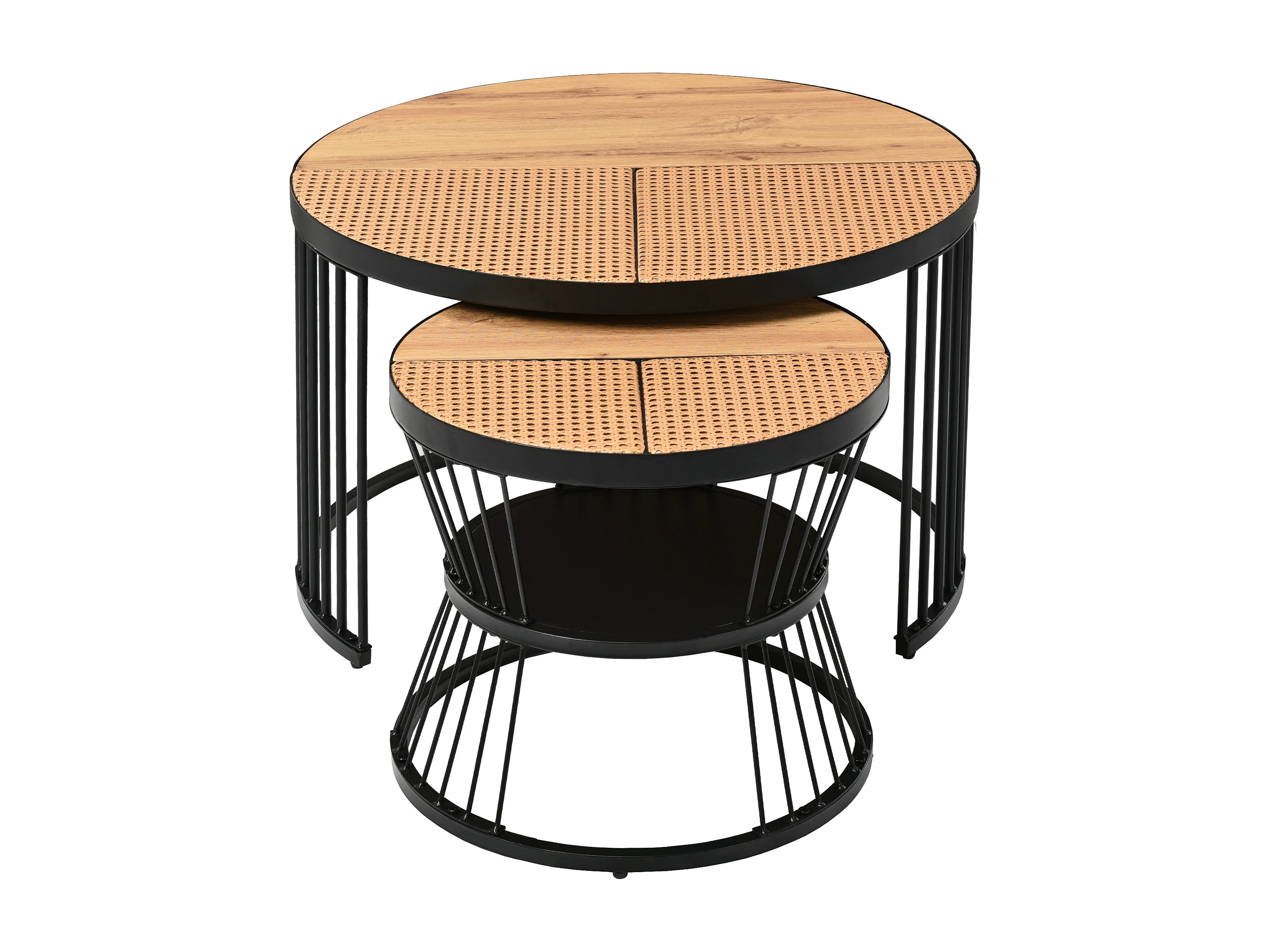 Lot de 2 Tables basses gigognes avec plateau en placage woodgrain et rotin naturel, cadre en métal noir