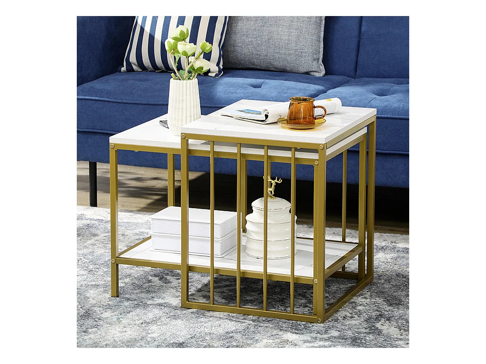 Lot de 2 tables basses gigognes carrés - plateau blanc aspect marbre et pied en métal doré
