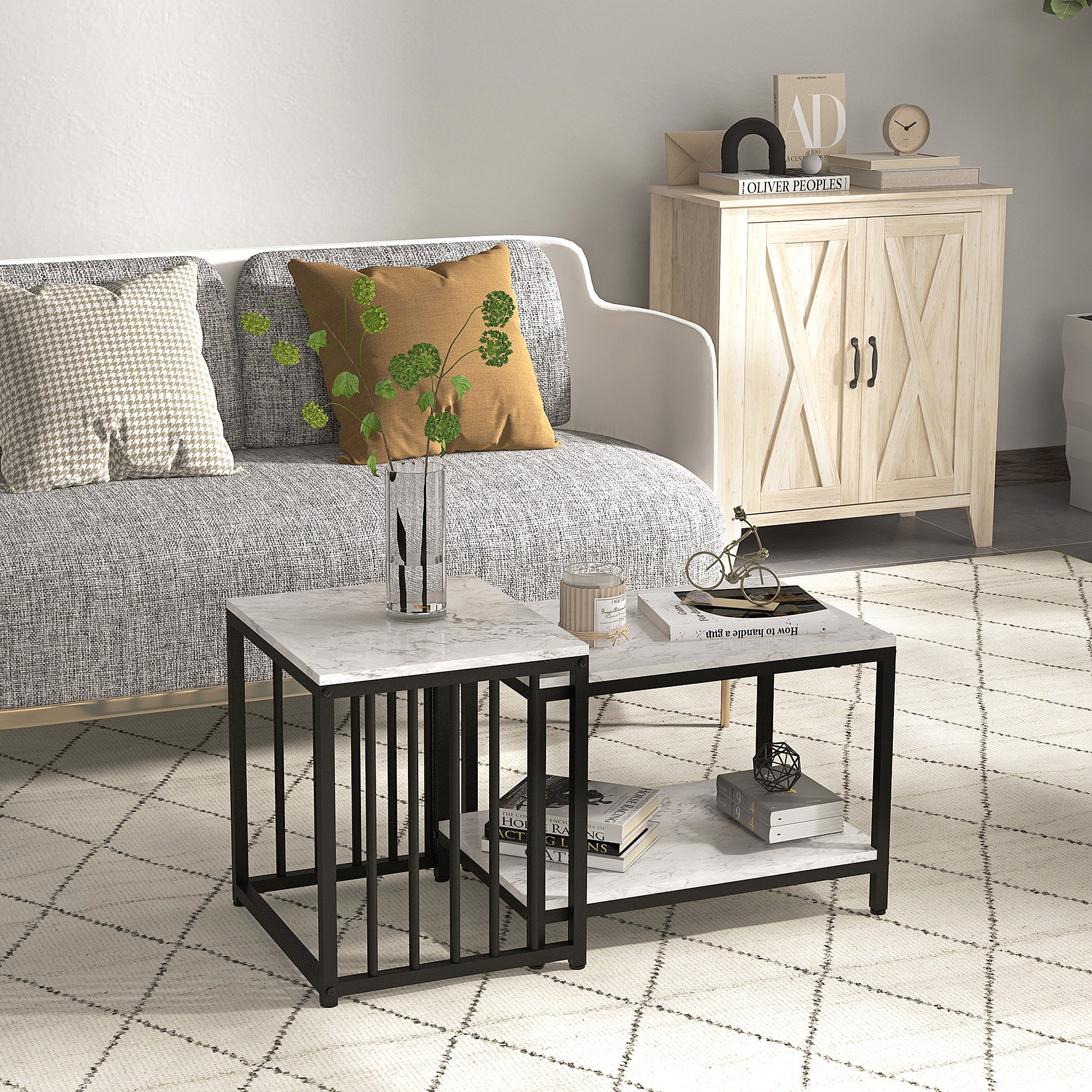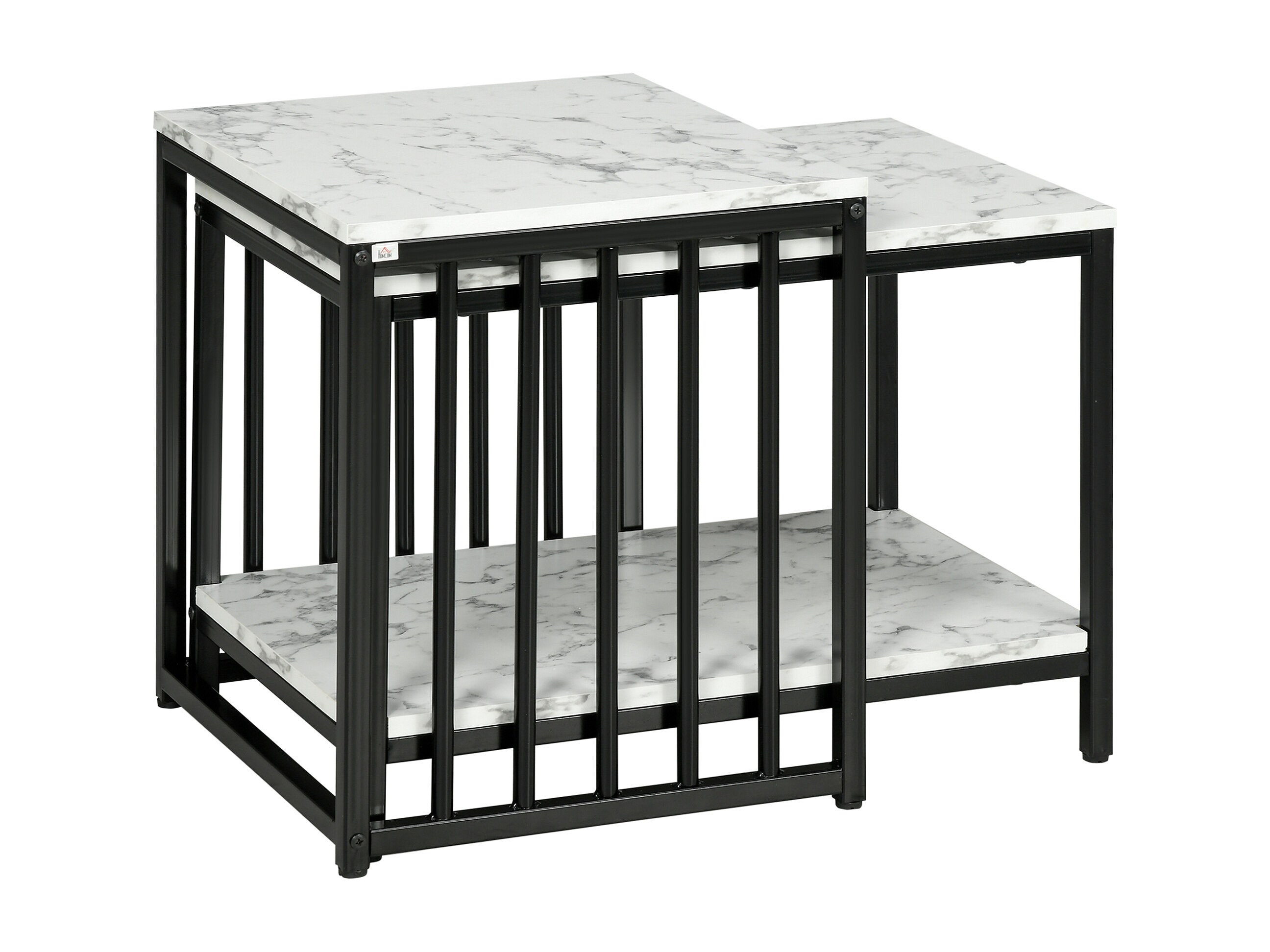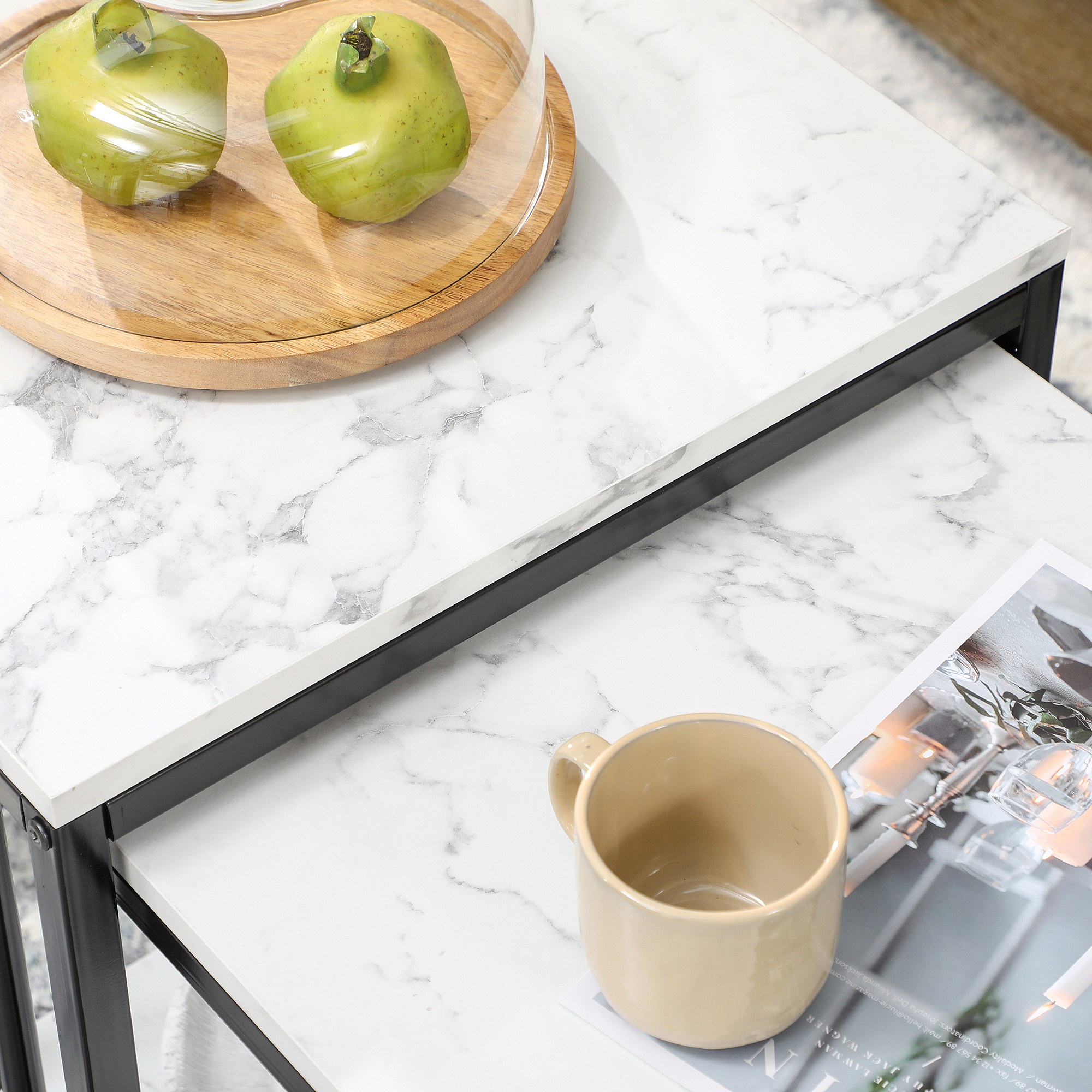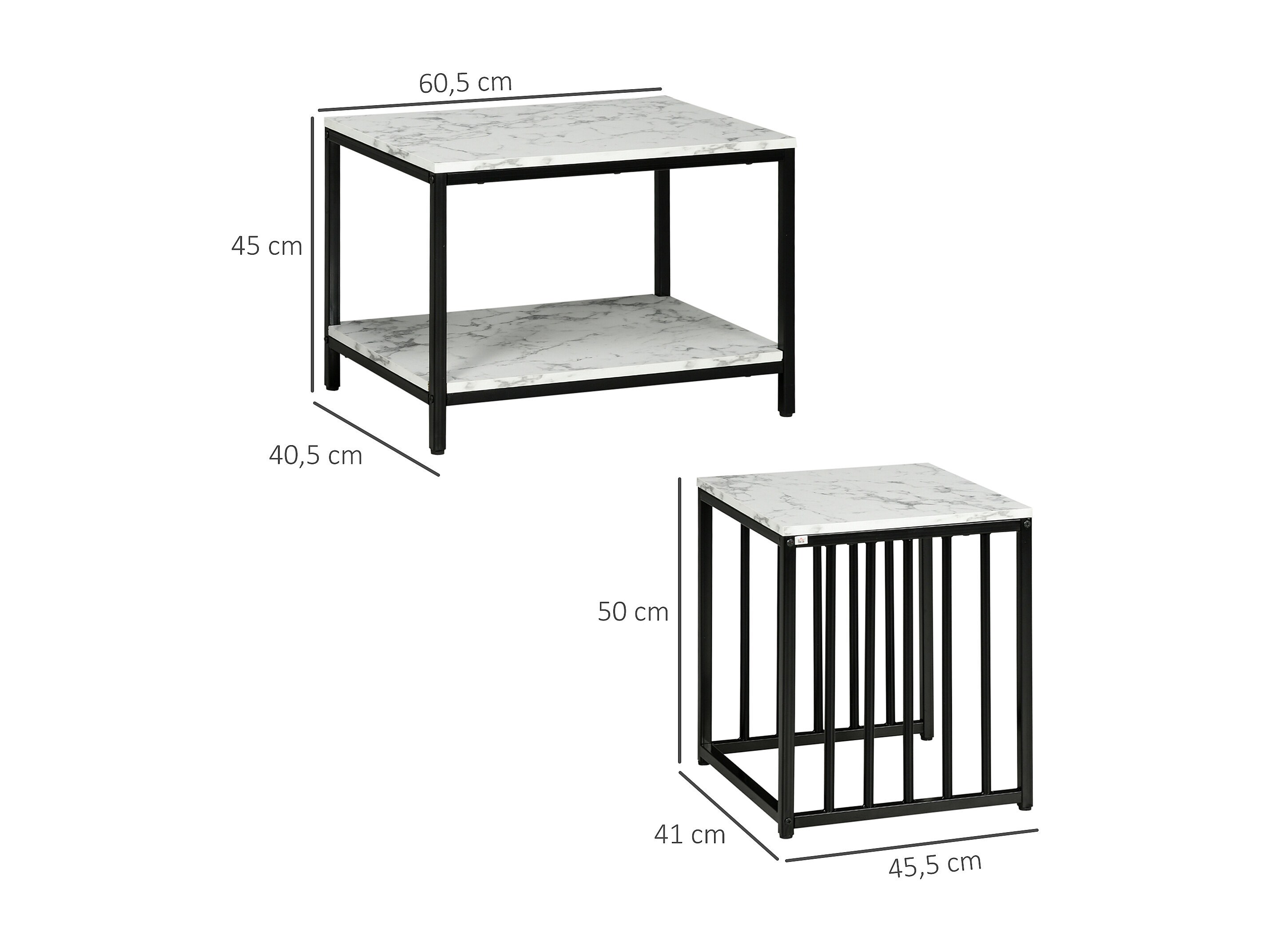 Lot de 2 tables basses gigognes design - acier noir panneaux aspect marbre blanc