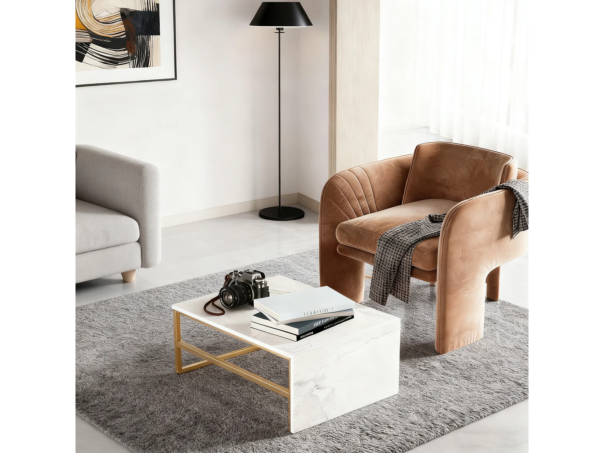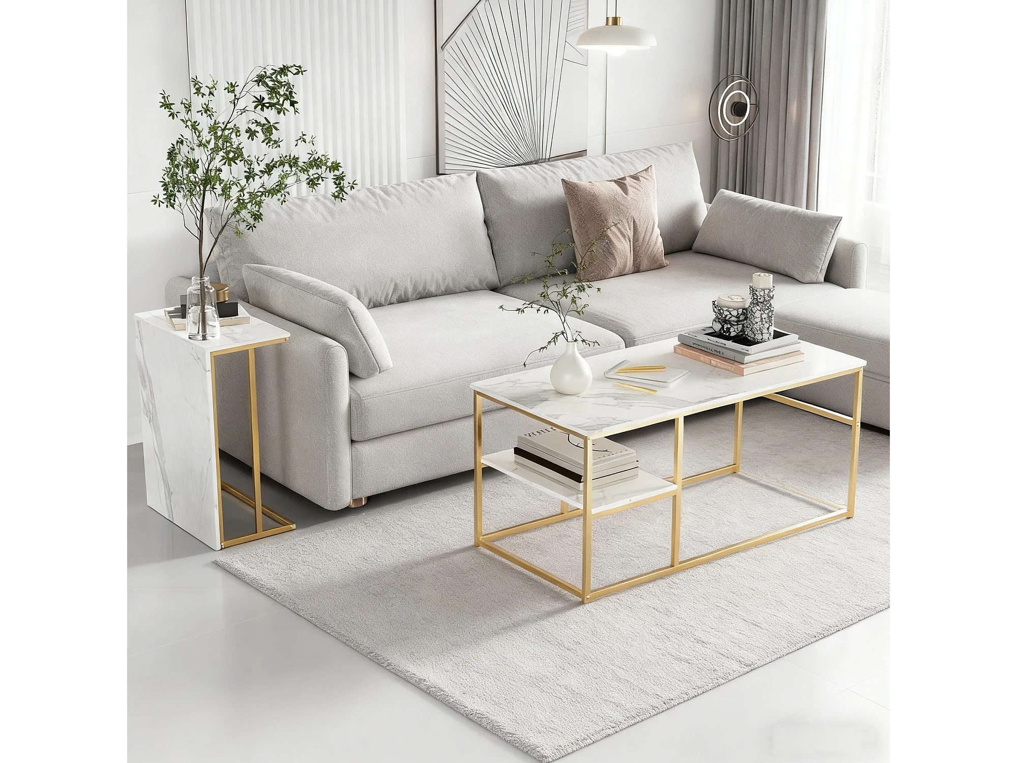 Lot de 2 tables basses gigognes en forme carrée - aspect marbre brillant - Bois MDF et pieds en métal - Blanc + Doré