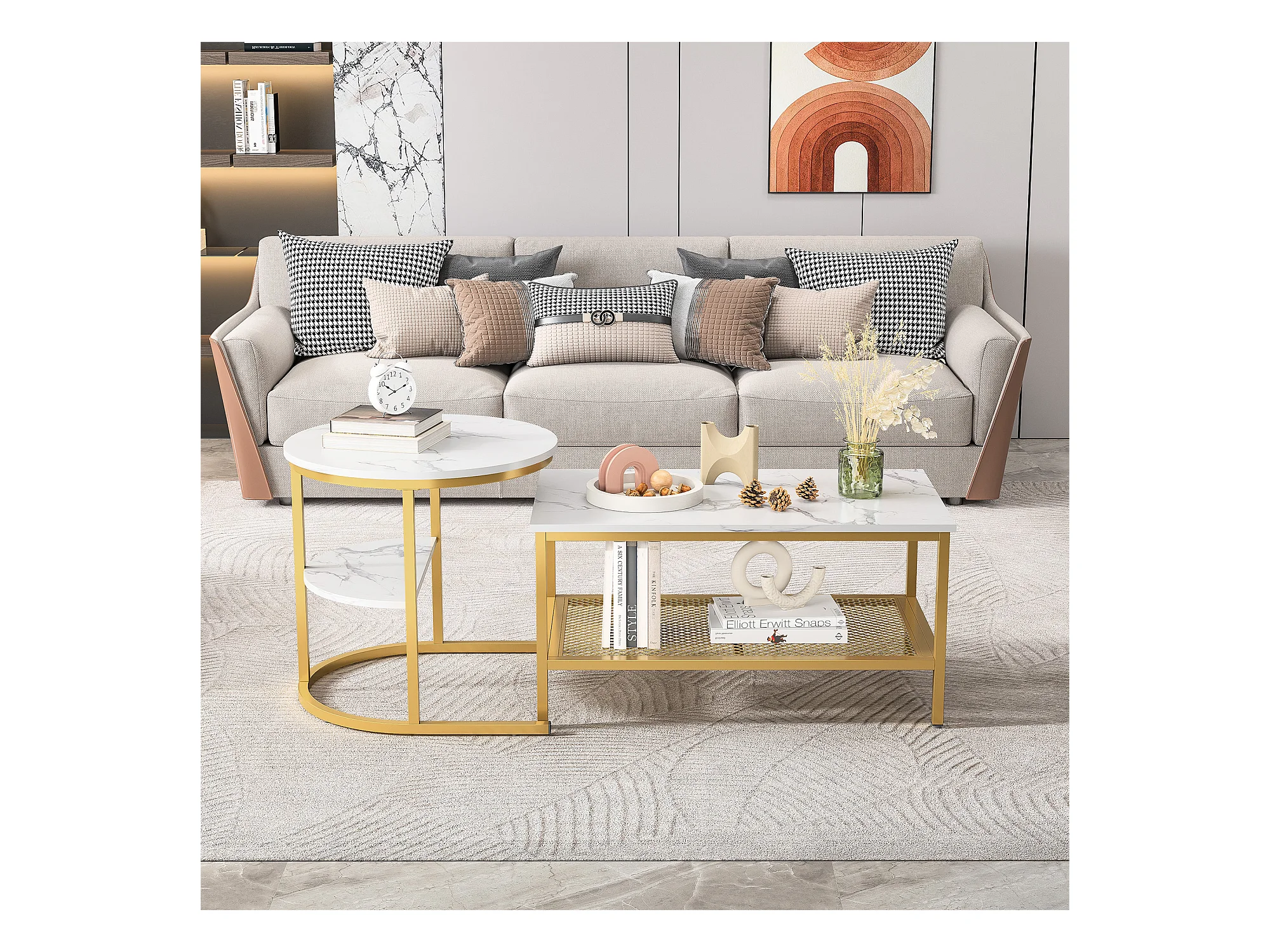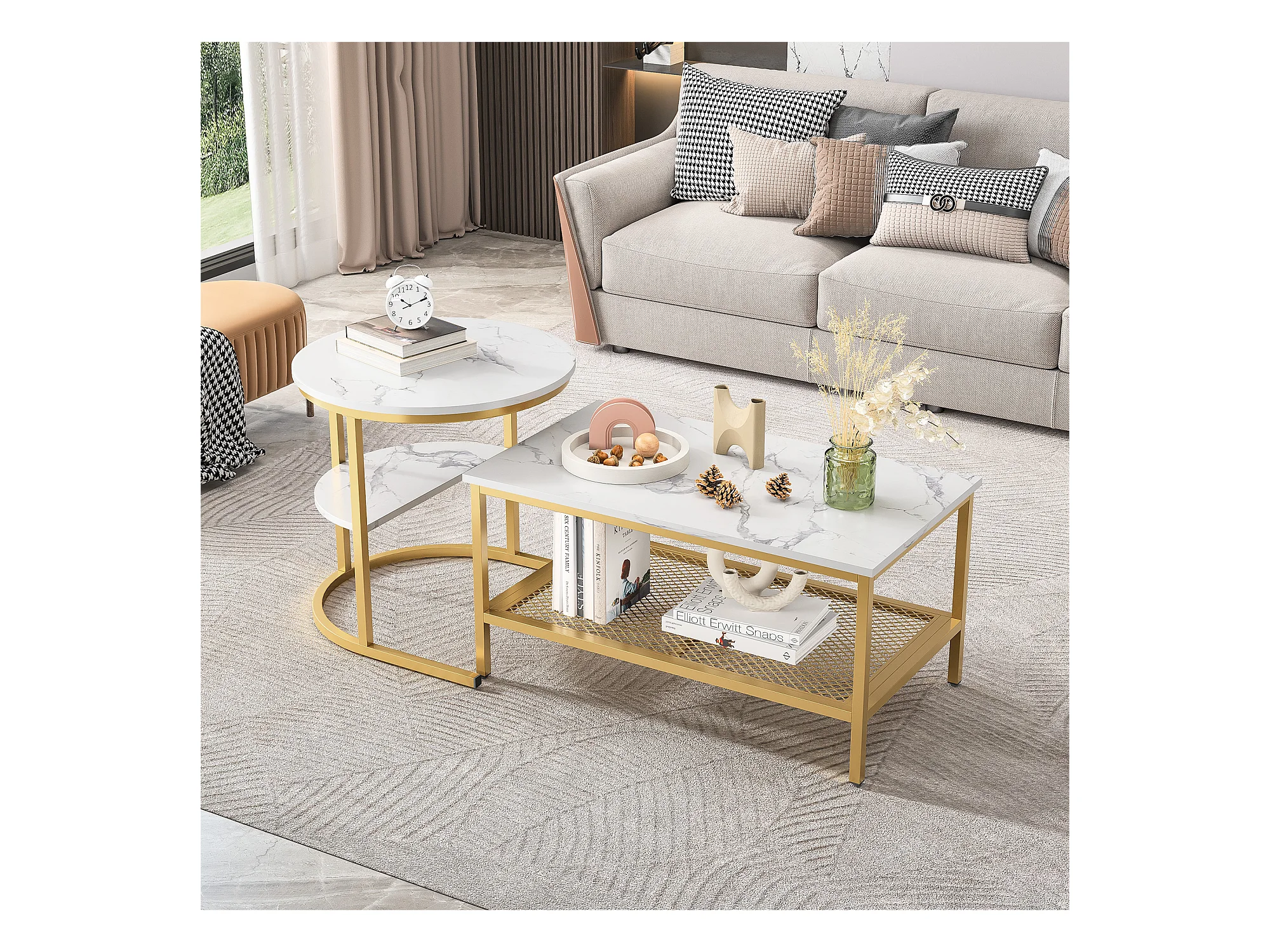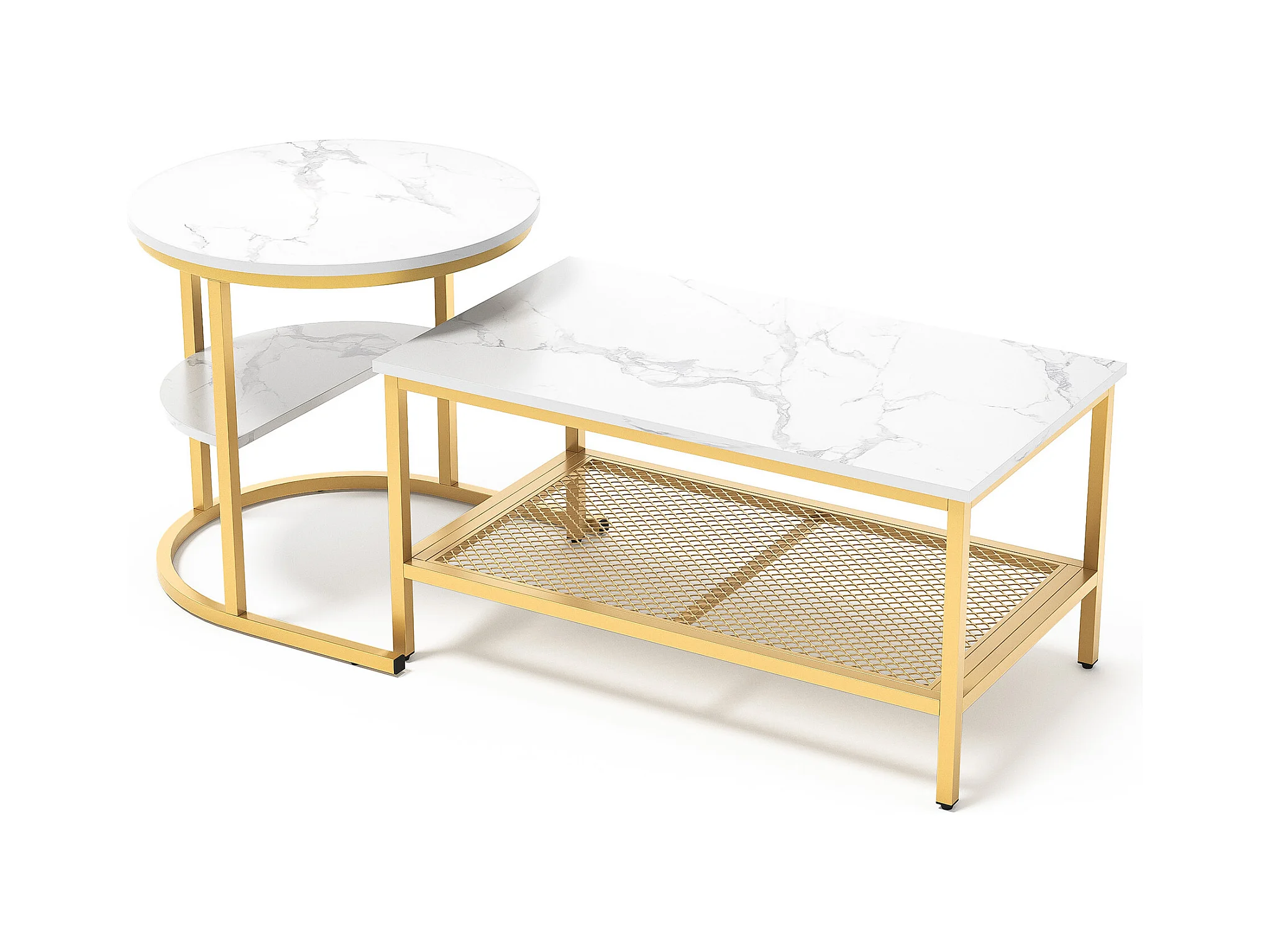 Lot de 2 Tables Basses Gigognes Modernes avec Cadre en Métal Doré et Placage Marbre, Table Basse Salon Rectangulaire, Table d'Appoint Ronde pour Canapé et Chambre