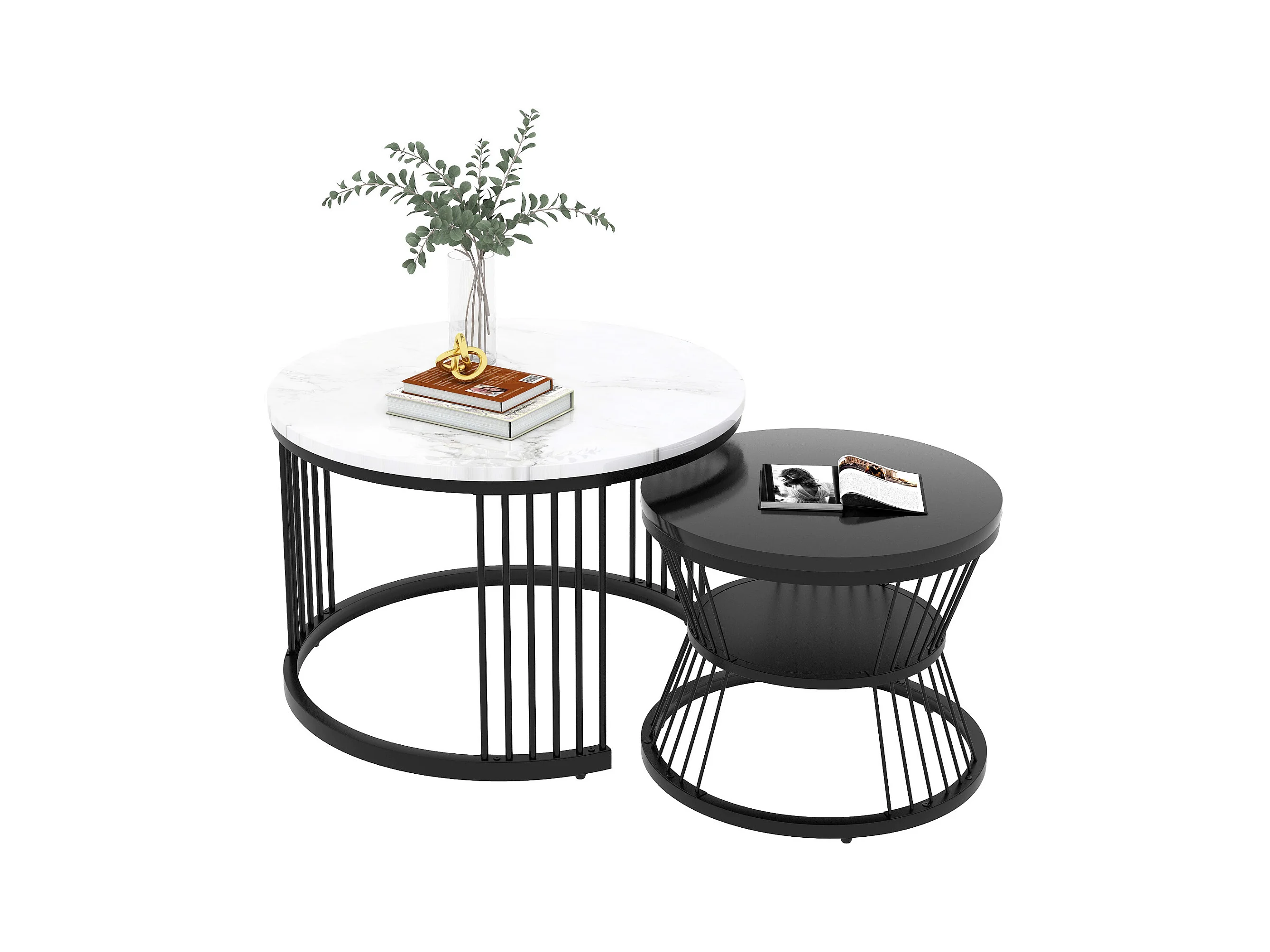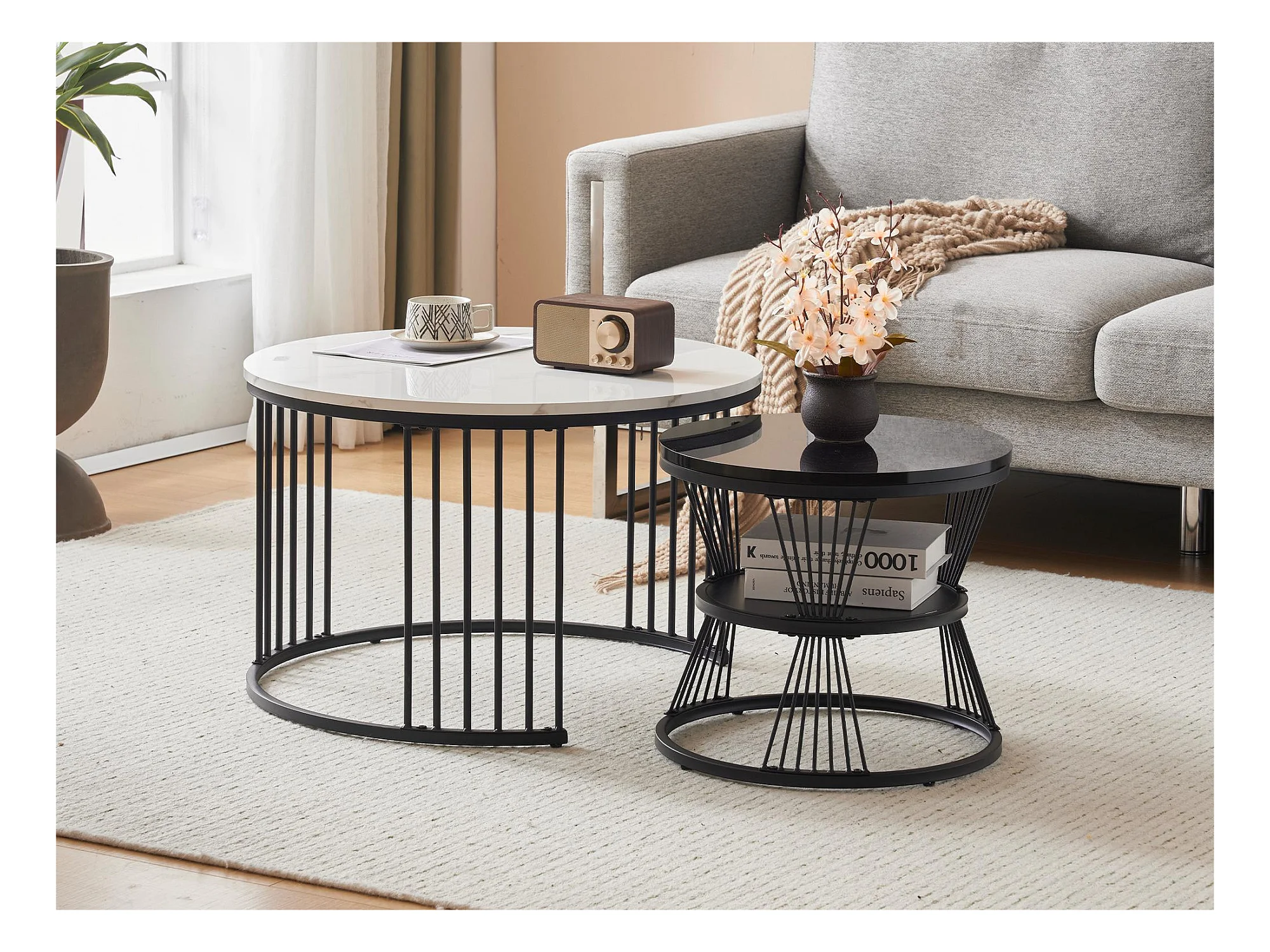 Table basse gigogne ronde, lot de 2, table basse gigogne blanche, cadre en métal noir, placage de marbre