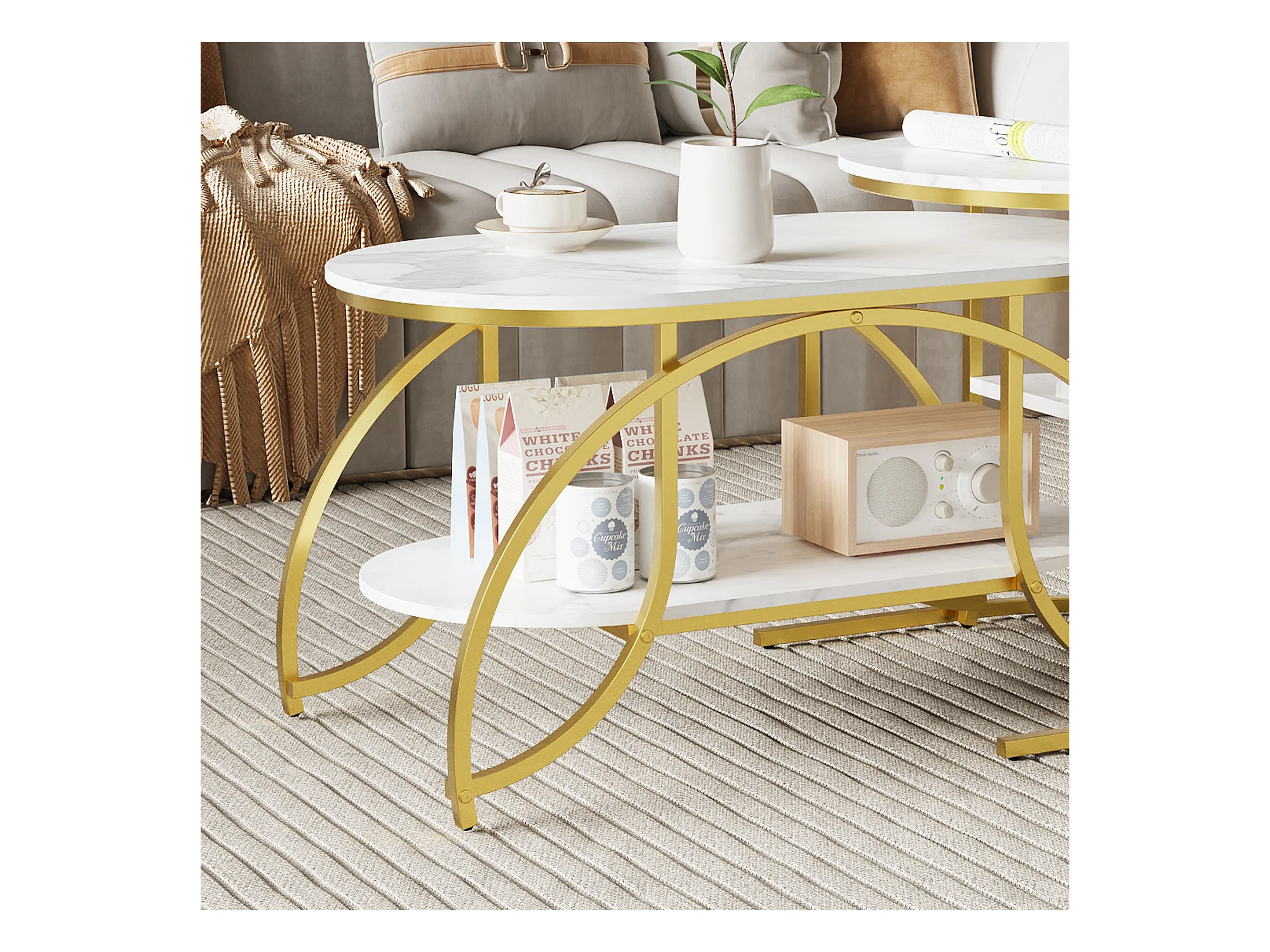 Lot de 2 Tables Basses Gigognes,Table Basse Effet Marbre,Conception Minimaliste de Support en Métal Géométrique,Facile à Assembler, Doré + Blanc