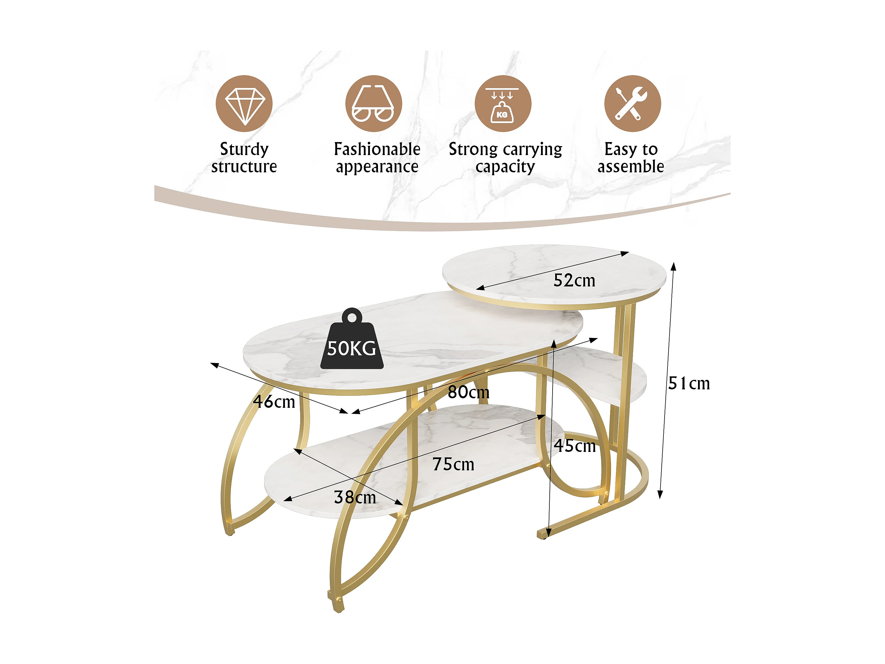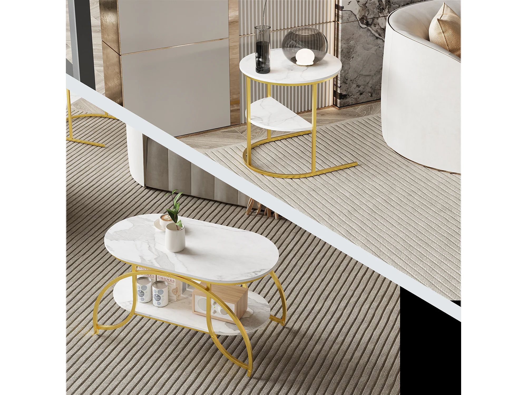 Lot de 2 Tables Basses Gigognes - Effet Marbre - Conception Minimaliste de Support en Métal Géométrique - Facile à Assembler - Doré + Blanc