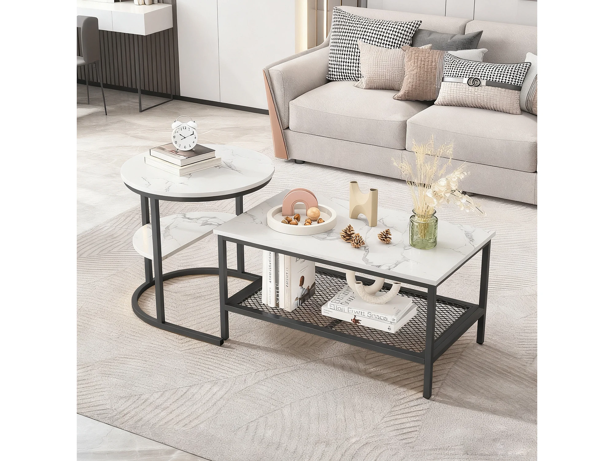 Lot de 2 tables basses gigognes - table d'appoint ronde et carrée - aspect marbre brillant - MDF et - métal - pour salon et chambre - Blanc + Noir